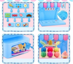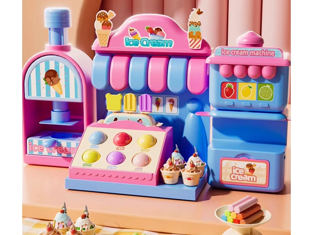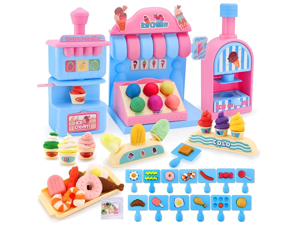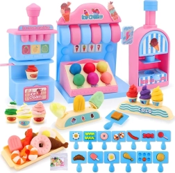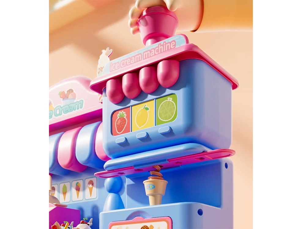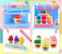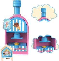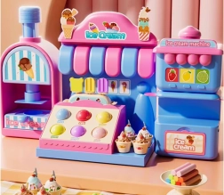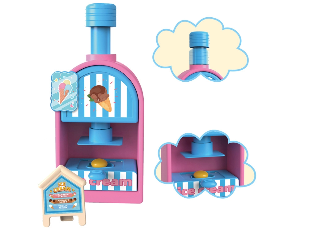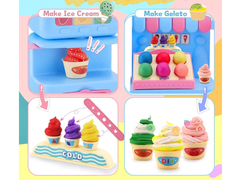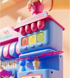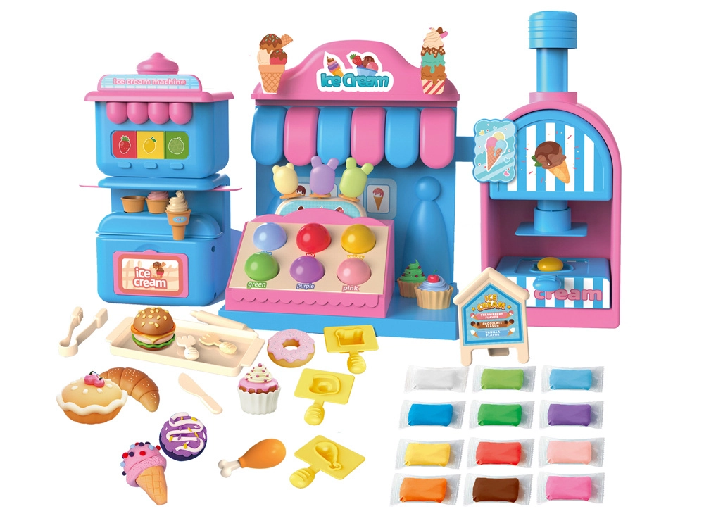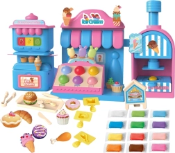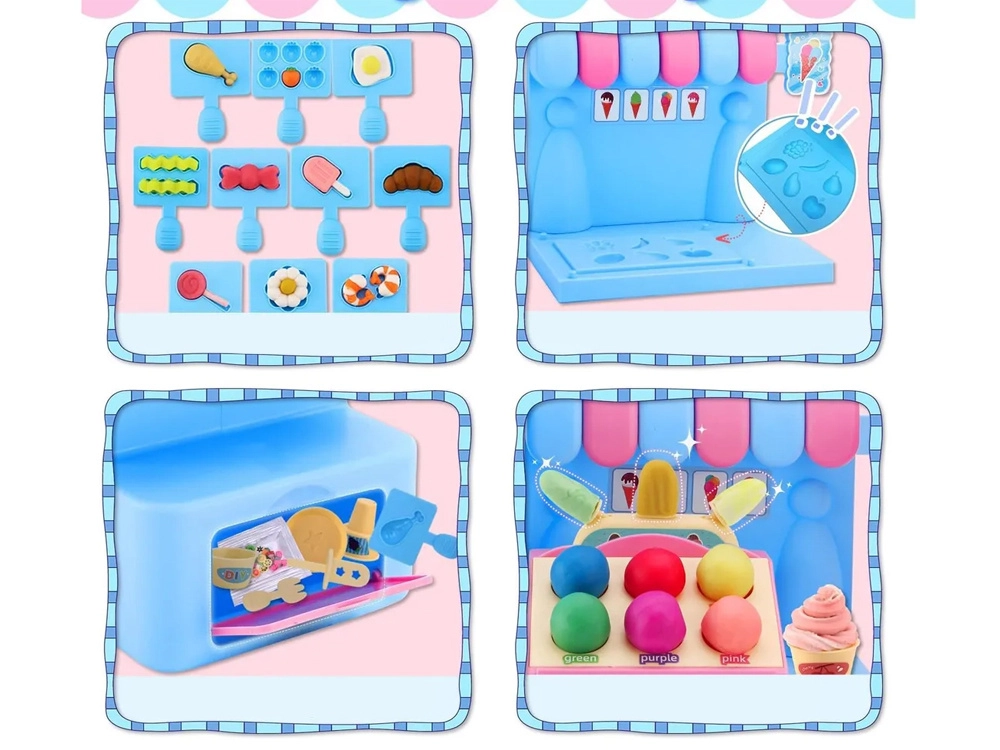 Το ολοκληρωμένο σετ παιχνιδιού περιλαμβάνει μηχανή παγωτού για έξοδο χρωματιστών μερίδων, πάγκο πώλησης για έκθεση των γλυκών και πρέσα με «φόρμα ψησίματος» για διαμόρφωση κεκάκια και μπισκότων. Όλα είναι συντονισμένα σε απαλές αποχρώσεις ροζ και μπλε ώστε οι δημιουργίες να μοιάζουν με βιτρίνα πραγματικού ζαχαροπλαστείου.