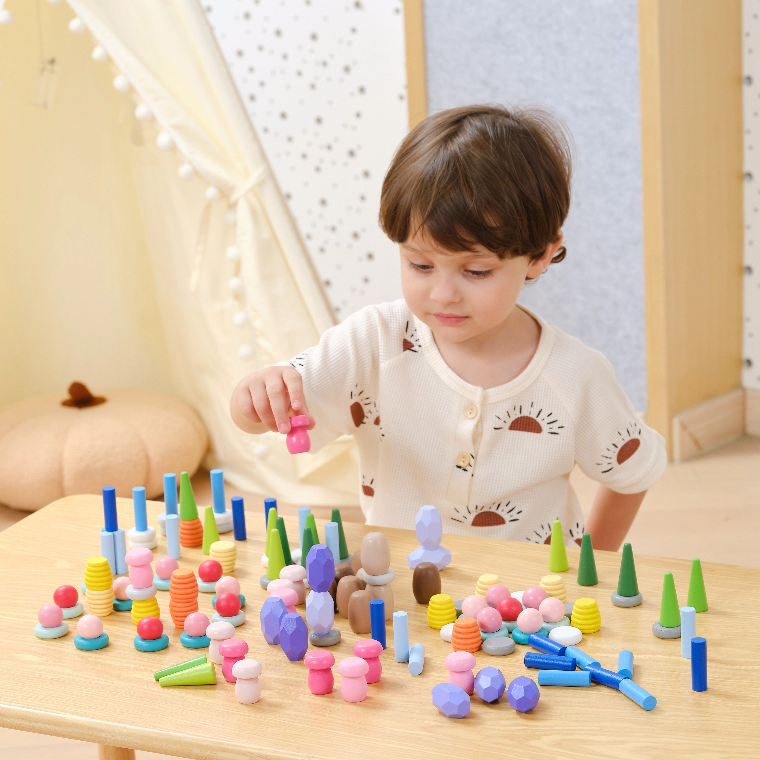 Λεία ξύλινα σχήματα, δαχτυλίδια, κώνοι και «πετράδια» ενθαρρύνουν το πιάσιμο, το περασμά τους σε κορδόνι και την εξισορρόπηση, υποστηρίζοντας την ακρίβεια των κινήσεων και τον οπτικοκινητικό συντονισμό.