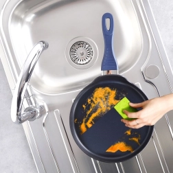 Η λαβή με μαλακή σιλικόνη παραμένει κρύα και είναι άνετη στο κράτημα. Το χαμηλό χείλος διευκολύνει το άδειασμα του μείγματος, το ανασήκωμα και το γύρισμα των κρεπών. Το τηγάνι είναι χωρίς PFOA και PTFE, ανθεκτικό στα καθαριστικά και χάρη στον επαγωγικό πάτο είναι συμβατό με όλους τους τύπους εστιών.