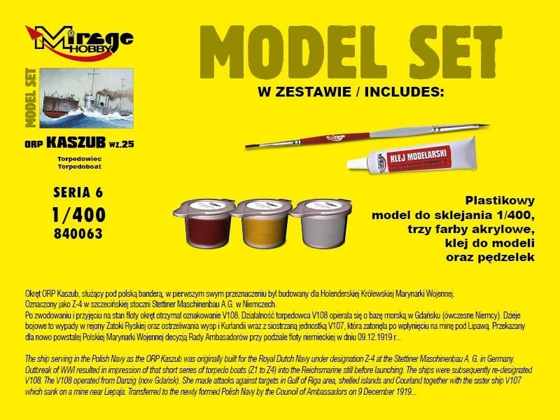 Συναρμολογήστε το δικό σας μοντέλο του πολικού αντιτορπιλικού ORP Kaszub του 1935 με αυτό το λεπτομερώς σχεδιασμένο πλαστικό κιτ σε κλίμακα 1:400. Το σετ περιλαμβάνει πλαστικό μοντέλο για κόλληση, τρία ακρυλικά χρώματα, κόλλα και πινέλο.
