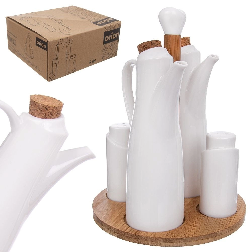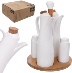 Ένα κομψό πορσελάνινο σετ για το τραπέζι με περιστρεφόμενη μπαμπού βάση κρατά τα μπαχαρικά και τα καρυκεύματά σας τακτοποιημένα και άμεσα διαθέσιμα. Περιλαμβάνει μπουκάλια για λάδι και ξίδι, αλατιέρα και πιπεριέρα. Οι πορσελάνινες θήκες είναι ανθεκτικές και εύκολες στο καθάρισμα, η μπαμπού βάση προσφέρει σταθερότητα και στυλ, οι φελλένιοι πώματα διατηρούν τη φρεσκάδα λαδιού και ξιδιού και οι πρακτικές διαστάσεις ταιριάζουν σε κάθε τραπέζι.