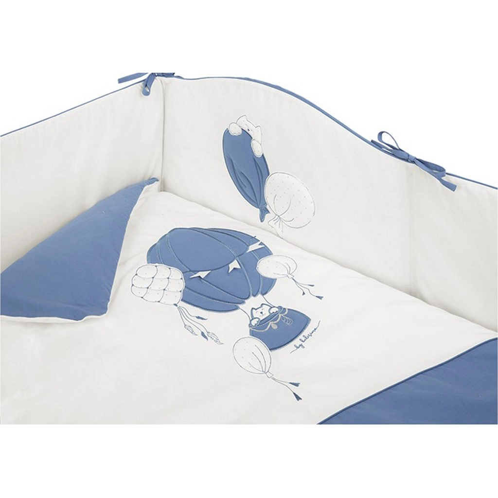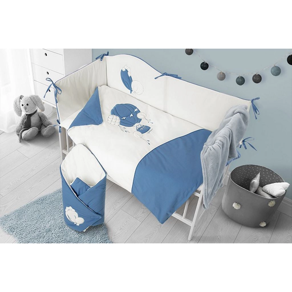 Το στιλάτο σετ κούνιας BELISIMA Ballons σε μπλε‑λευκό συνδυασμό ξεχωρίζει με τα παιχνιδιάρικα μοτίβα μπαλονιών και τις απαλές, χαλαρωτικές αποχρώσεις. Το φυσικά διαπνέον 100% βαμβάκι είναι ευχάριστο στην αφή και φιλικό προς το ευαίσθητο δέρμα του μωρού.