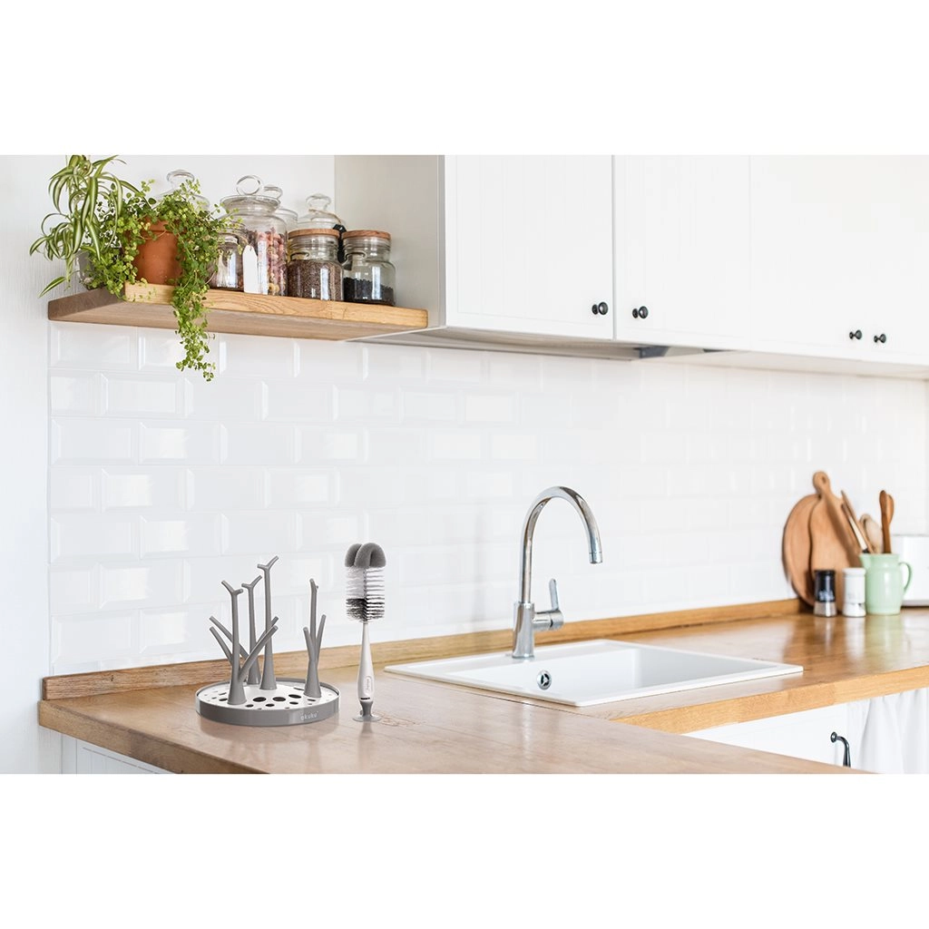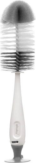 Η μεγάλη βούρτσα με τρίχες και απαλή σπογγώδη μύτη απομακρύνει αποτελεσματικά υπολείμματα γάλακτος και ρύπους ακόμη και από τον πάτο και τις γωνίες των μπουκαλιών χωρίς να τα γρατζουνίζει.