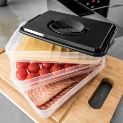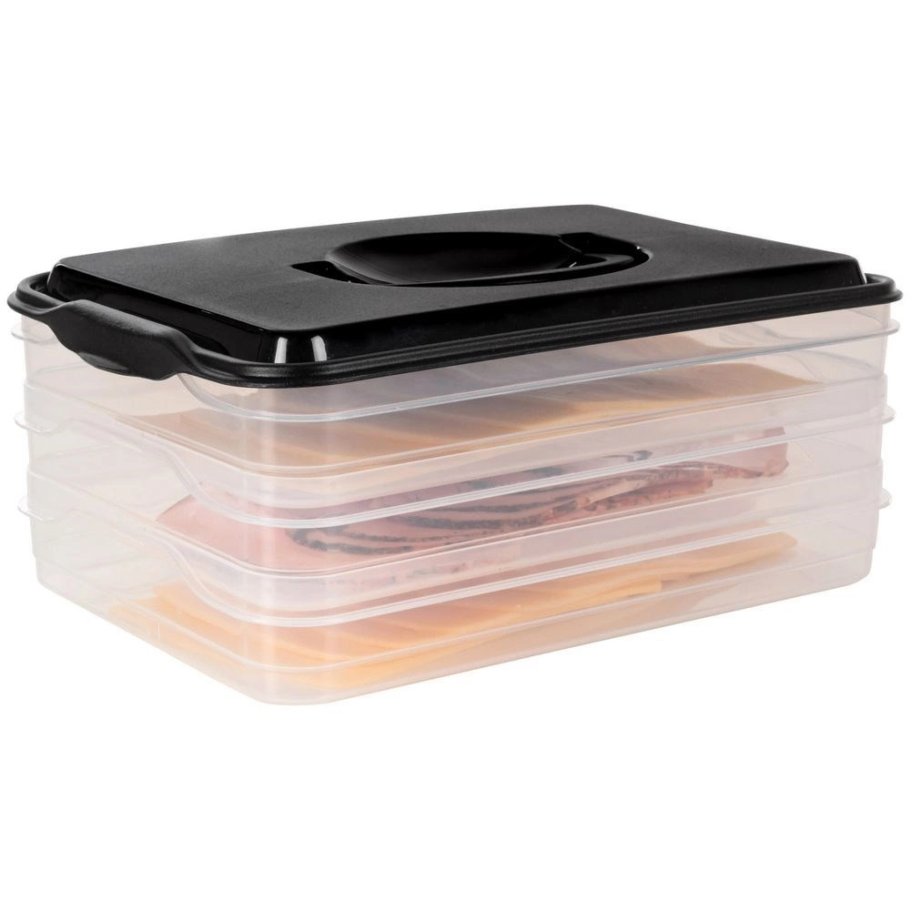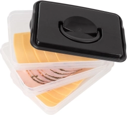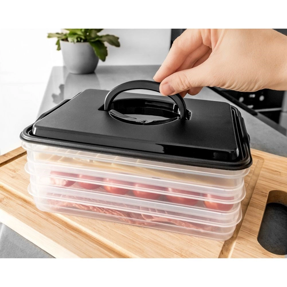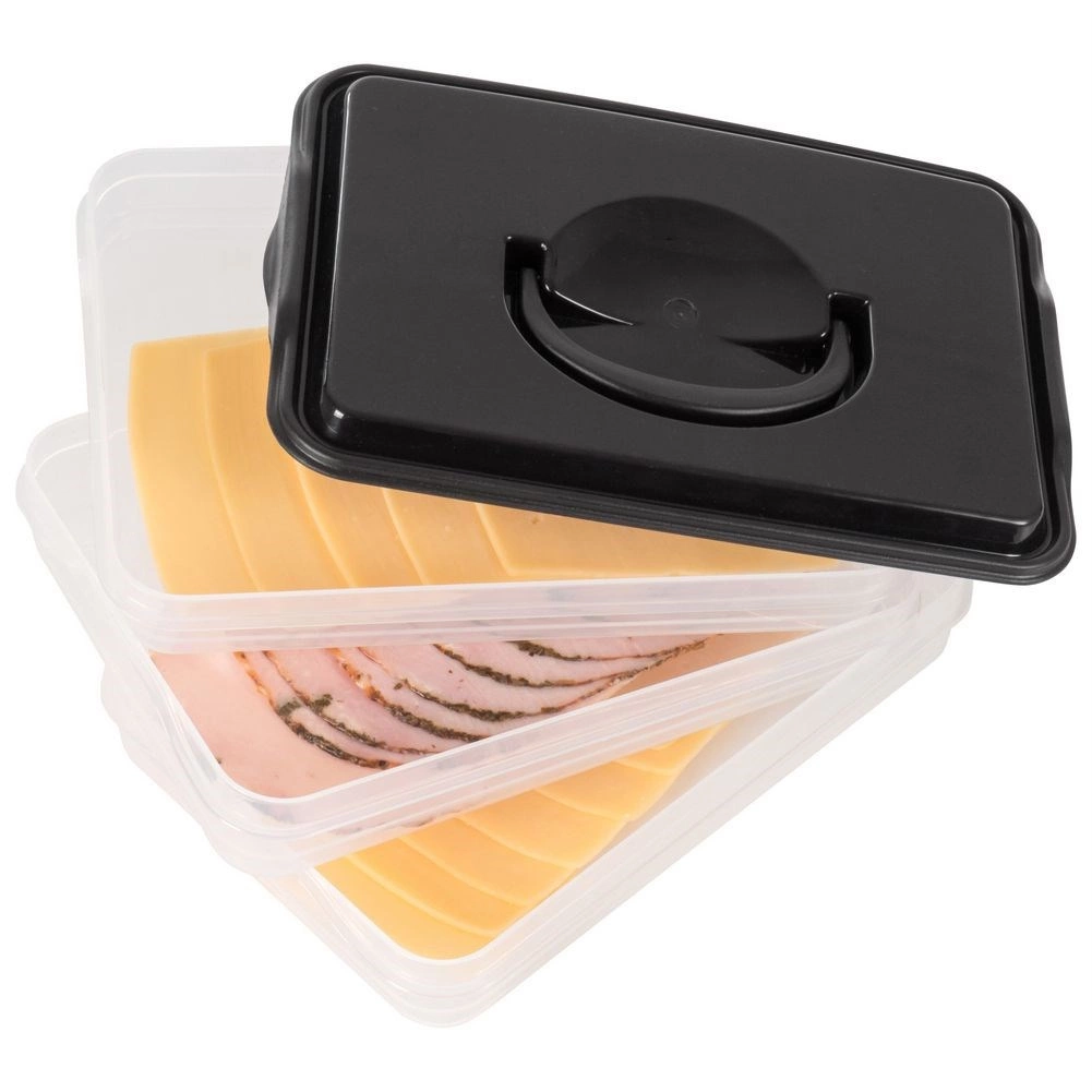 Αυτός ο έξυπνος οργανωτής τροφίμων προσφέρει τρία αποσπώμενα, διάφανα επίπεδα για άνετη αποθήκευση κομμένων τυριών, αλλαντικών και μικρών υλικών χωρίς ανάμειξη οσμών. Ο συμπαγής ορθογώνιος σχεδιασμός ταιριάζει ιδανικά στα ράφια του ψυγείου και το στιβαρό μαύρο κάλυμμα με λαβή εξασφαλίζει εύκολο χειρισμό.
