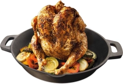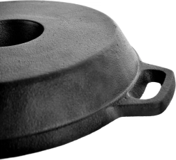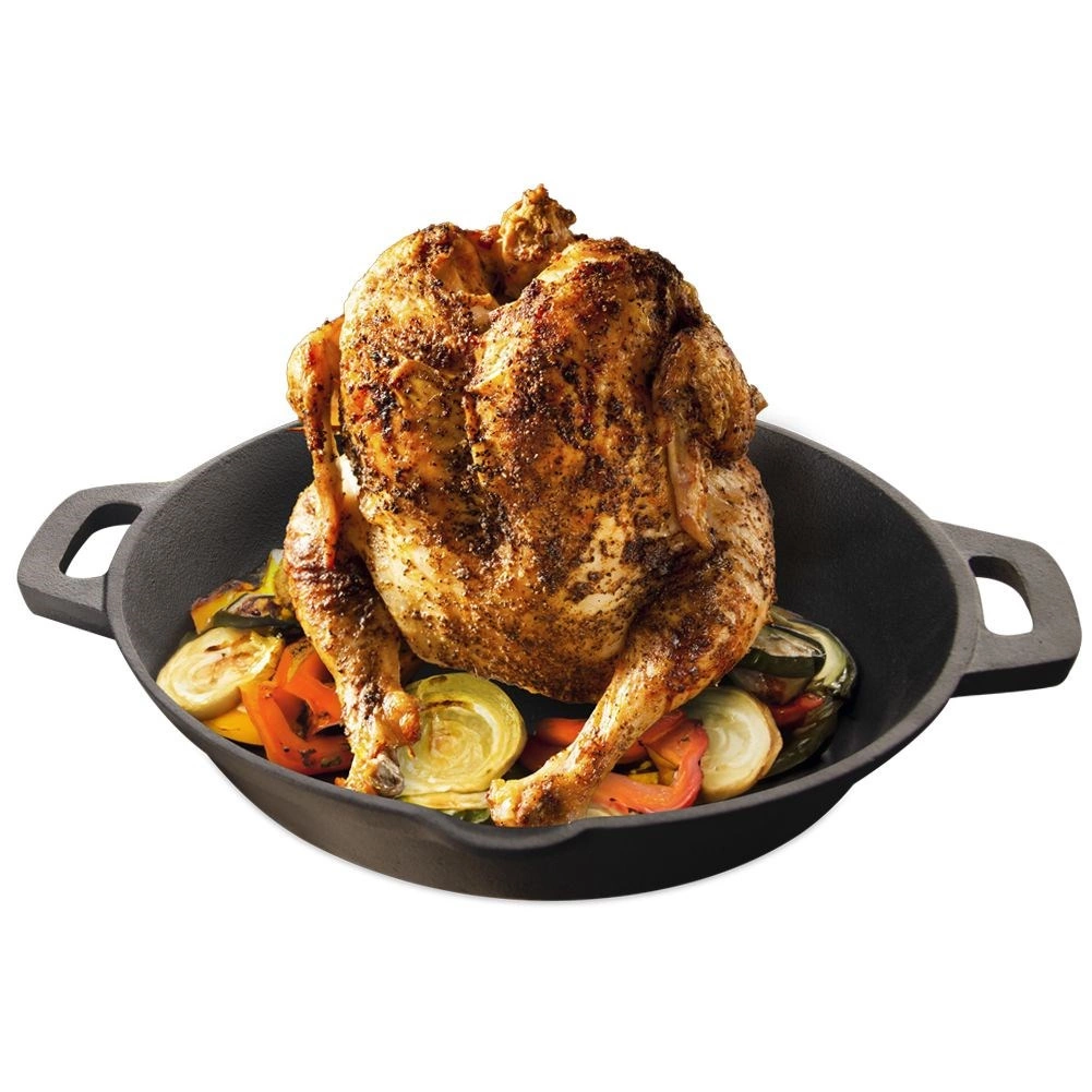 Αυτό το στιβαρό τηγάνι από χυτοσίδηρο με ενσωματωμένη βάση είναι φτιαγμένο για τέλειο ψητό κοτόπουλο – ακόμη και στο στυλ «μπύρα κάτω από το κοτόπουλο». Ο κεντρικός άξονας μπορεί να γεμίσει με μπύρα ή κρασί για έξτρα ζουμερότητα και άρωμα, ενώ γύρω χωρούν άνετα πατάτες ή λαχανικά. Ο χυτοσίδηρος εξασφαλίζει ομοιόμορφη κατανομή θερμότητας και την διατηρεί για ώρα, ώστε το φαγητό να μένει ζεστό περισσότερο.