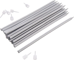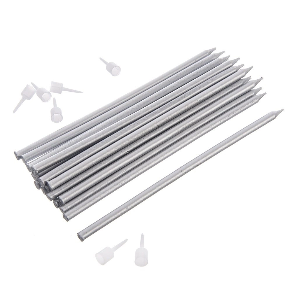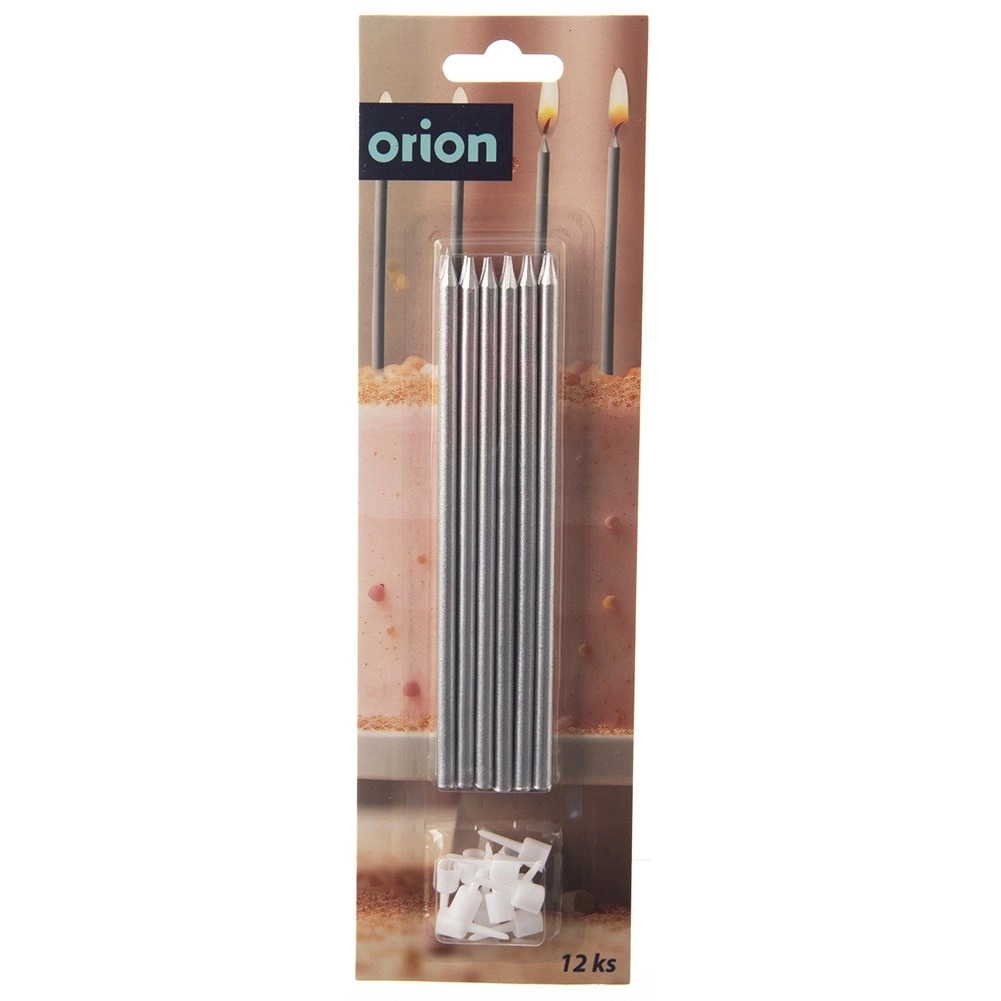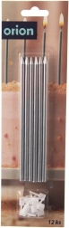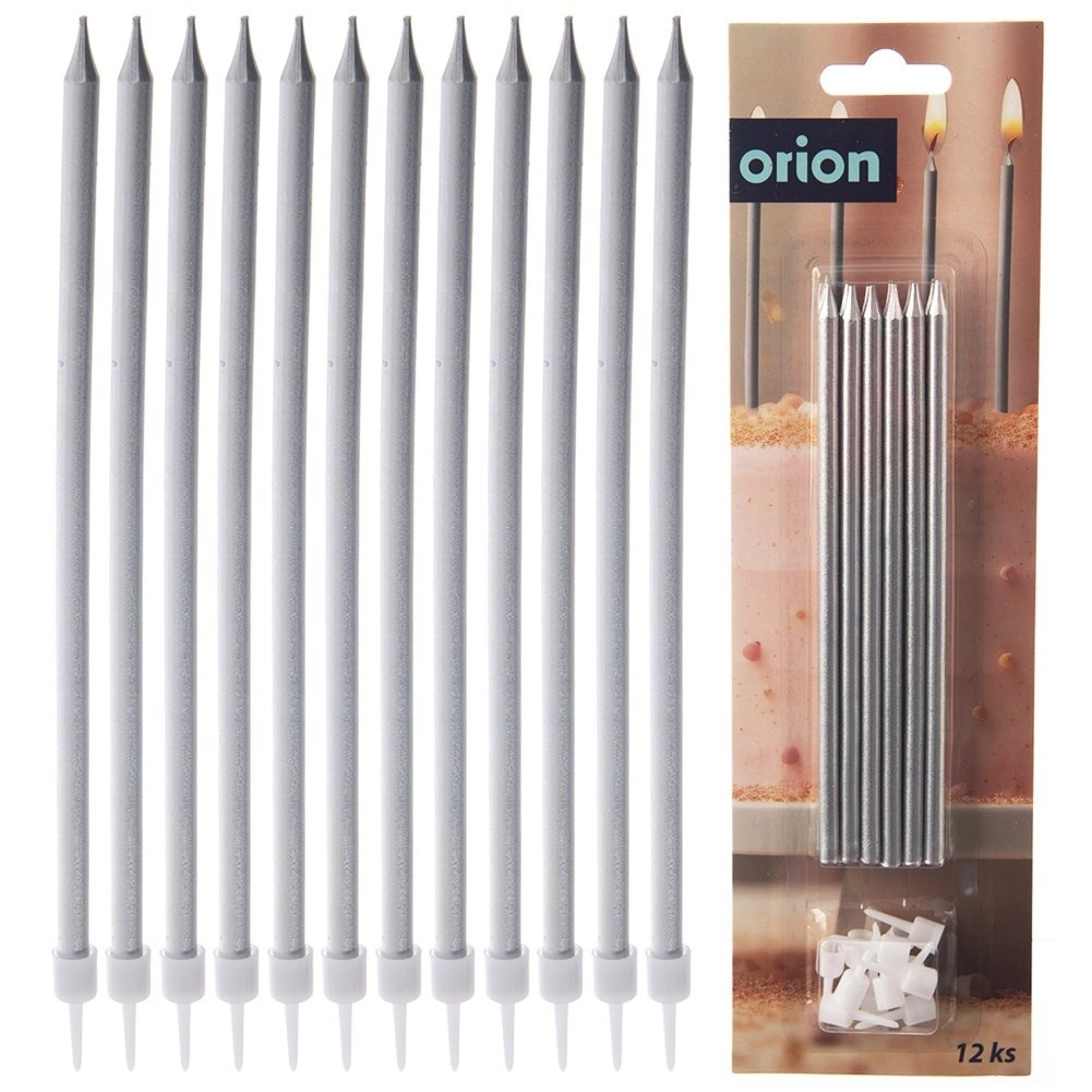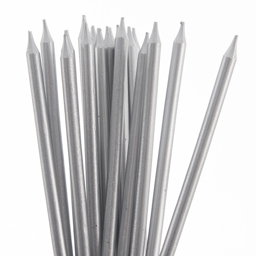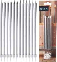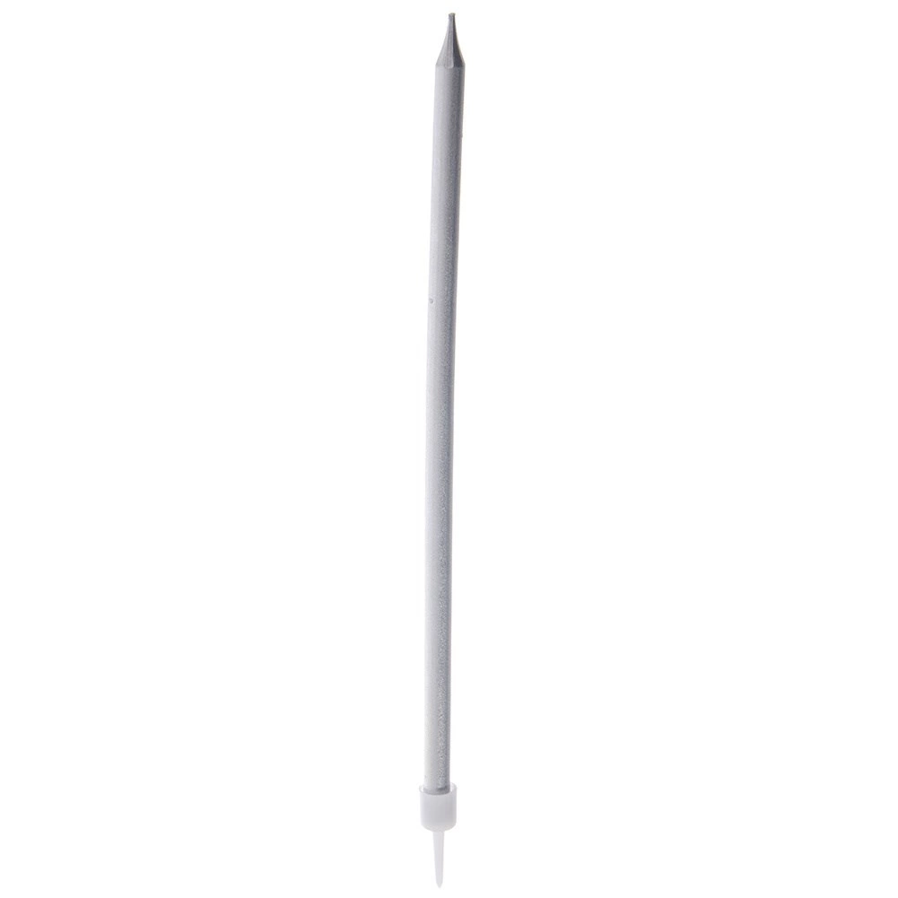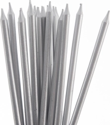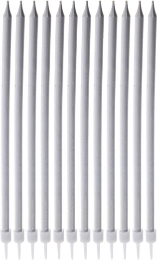 Κομψό σετ 12 μακριών κερακιών για τούρτα σε μεταλλική ασημένια απόχρωση, ύψους 14,5 cm, για εορταστικές τούρτες και επιδόρπια. Περιλαμβάνονται λευκές πλαστικές βάσεις για σταθερή στερέωση. Ο φρέσκος σχεδιασμός και το εντυπωσιακό ύψος χαρίζουν σε κάθε γιορτή ξεχωριστή εμφάνιση. Η ουδέτερη ασημένια απόχρωση ταιριάζει σε κάθε τούρτα.