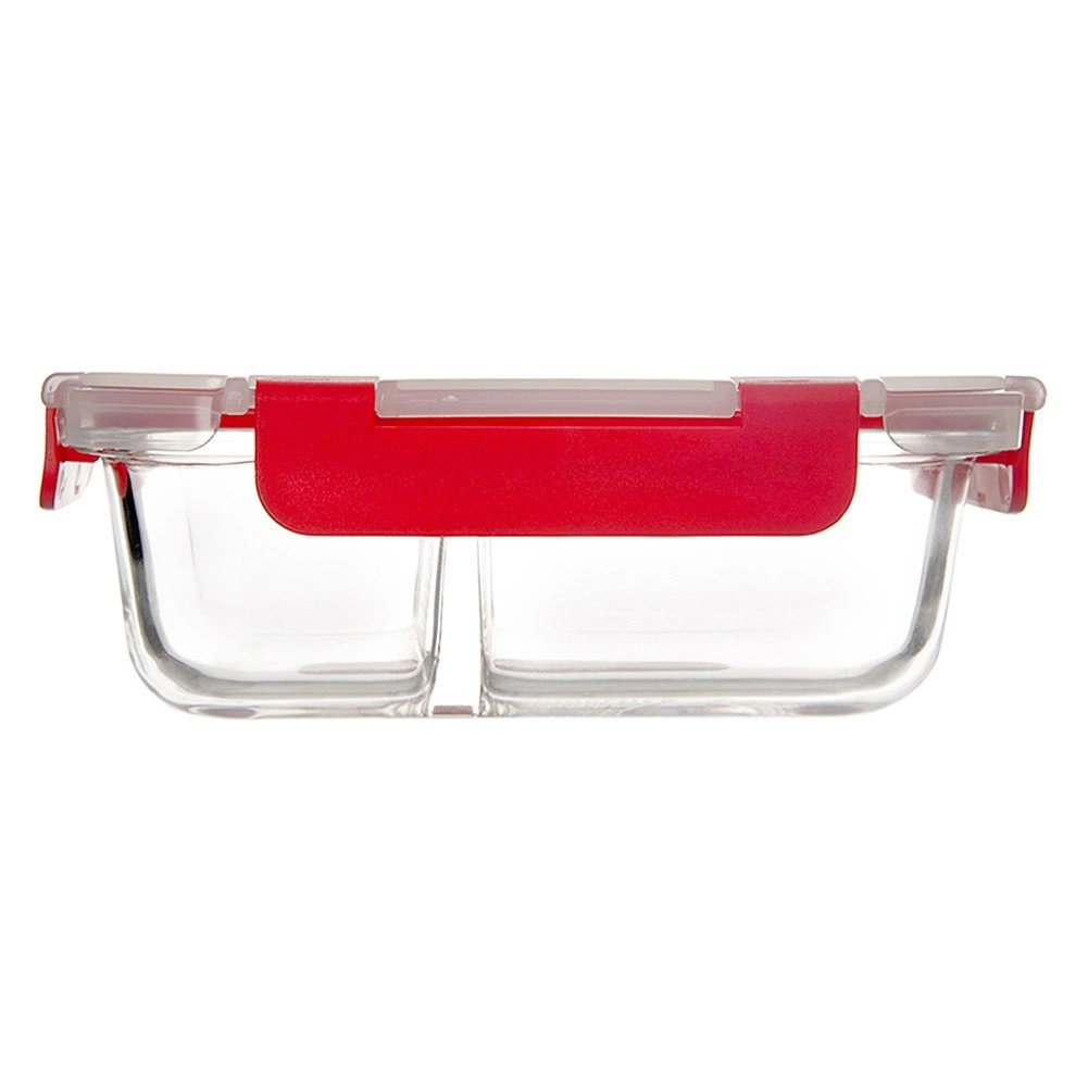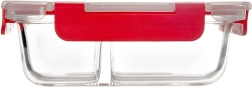 Πρακτικό γυάλινο lunch box χωρητικότητας 950 ml με δύο χωριστές θήκες, που κρατά το φαγητό σας τακτοποιημένο χωρίς ανάμειξη γεύσεων. Ανθεκτικό βοριοπυριτικό γυαλί, τέσσερις στιβαροί κλιπς και σιλικονούχο παρέμβυσμα εξασφαλίζουν 100% στεγανότητα και φρεσκάδα. Κατάλληλο για φούρνο μικροκυμάτων (χωρίς καπάκι), φούρνο (χωρίς καπάκι), καταψύκτη και πλυντήριο πιάτων.