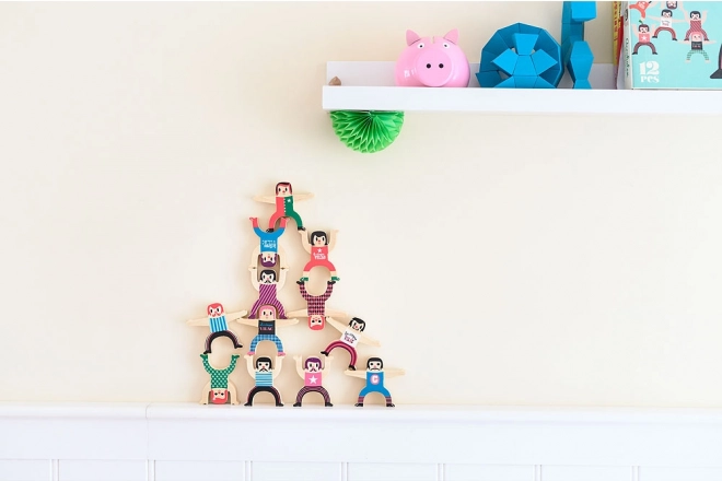 Χτίστε τον δικό σας πύργο ακροβατών και δοκιμάστε την επιδεξιότητα και τη φαντασία σας. Οι ξύλινες φιγούρες σε ζωηρά χρώματα μπορούν να στοιβαχτούν σε πολλές σταθερές ή τολμηρές στάσεις, κάνοντας αυτό το παιχνίδι ιδανική επιλογή για ομαδικό παιχνίδι και εκμάθηση ισορροπίας.