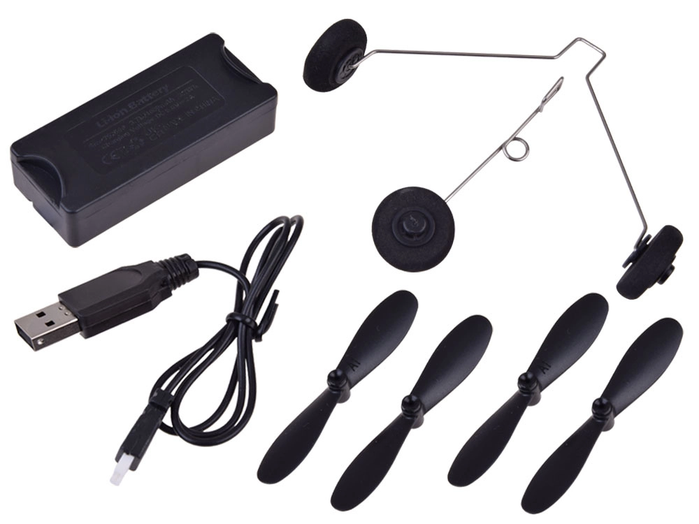Στη συσκευασία θα βρείτε ανταλλακτικές έλικες, σύστημα προσγείωσης, καλώδιο USB και πομπό RC 2,4 GHz. Απλώς συναρμολογήστε, φορτίστε και πετάξτε.