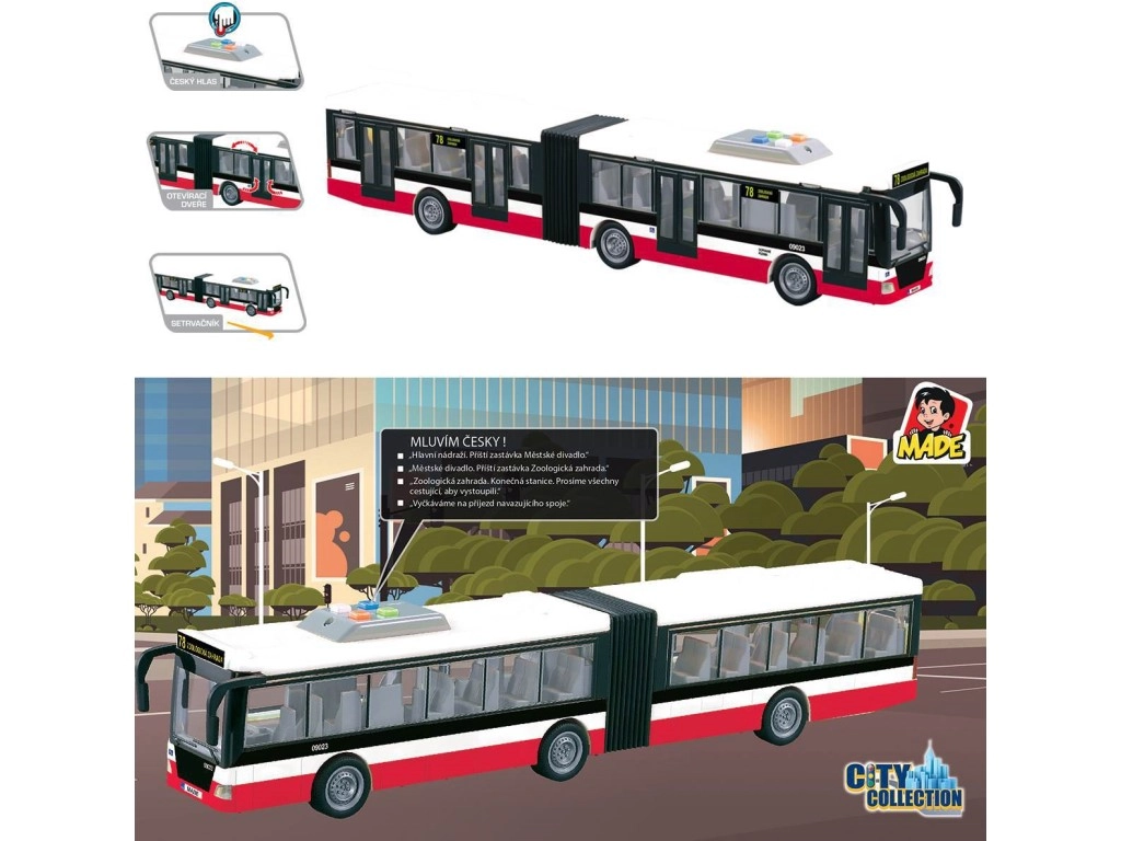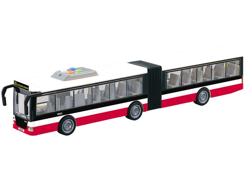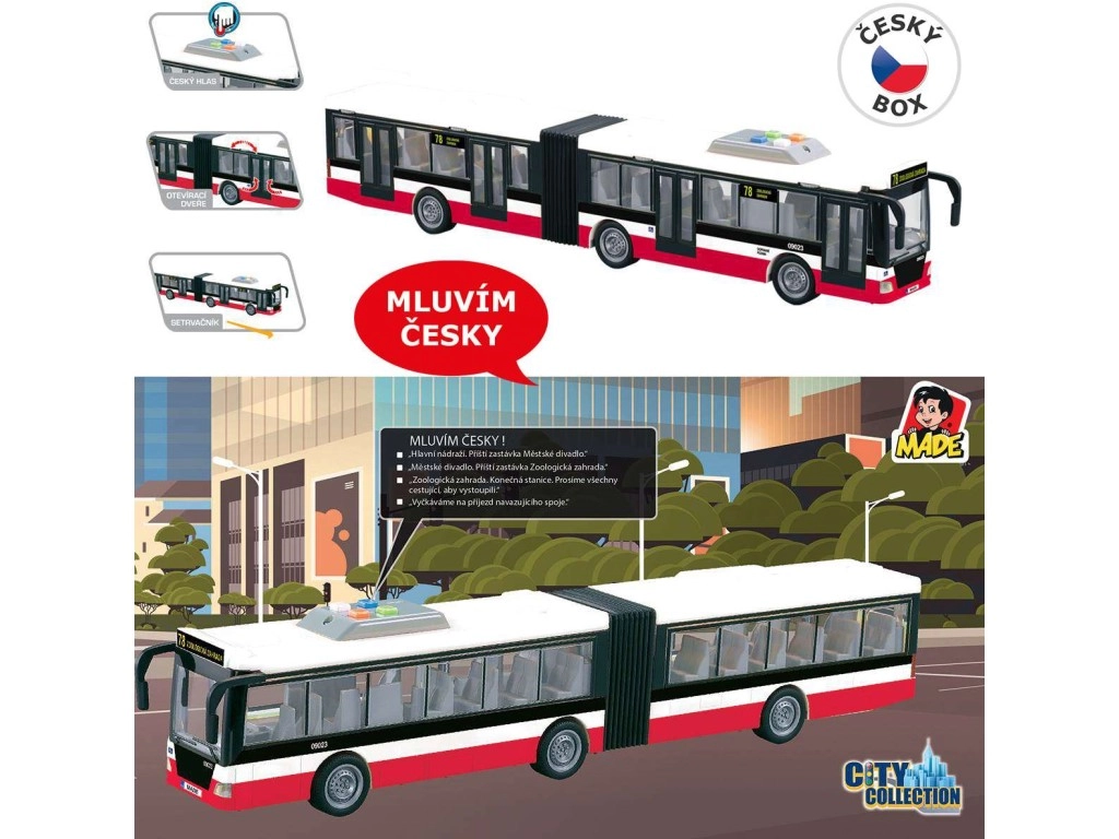 Αρθρωτό αστικό λεωφορείο με κίνηση αδράνειας, με φωτεινά εφέ και τσεχικές ανακοινώσεις στάσεων, που θα ενθουσιάσει όλους τους μικρούς οδηγούς. Προσφέρει εύκαμπτο σύνδεσμο, ρεαλιστικό τσέχικο design και είναι έτοιμο για παιχνίδι αμέσως μετά το άνοιγμα χάρη στις μπαταρίες στη συσκευασία.
