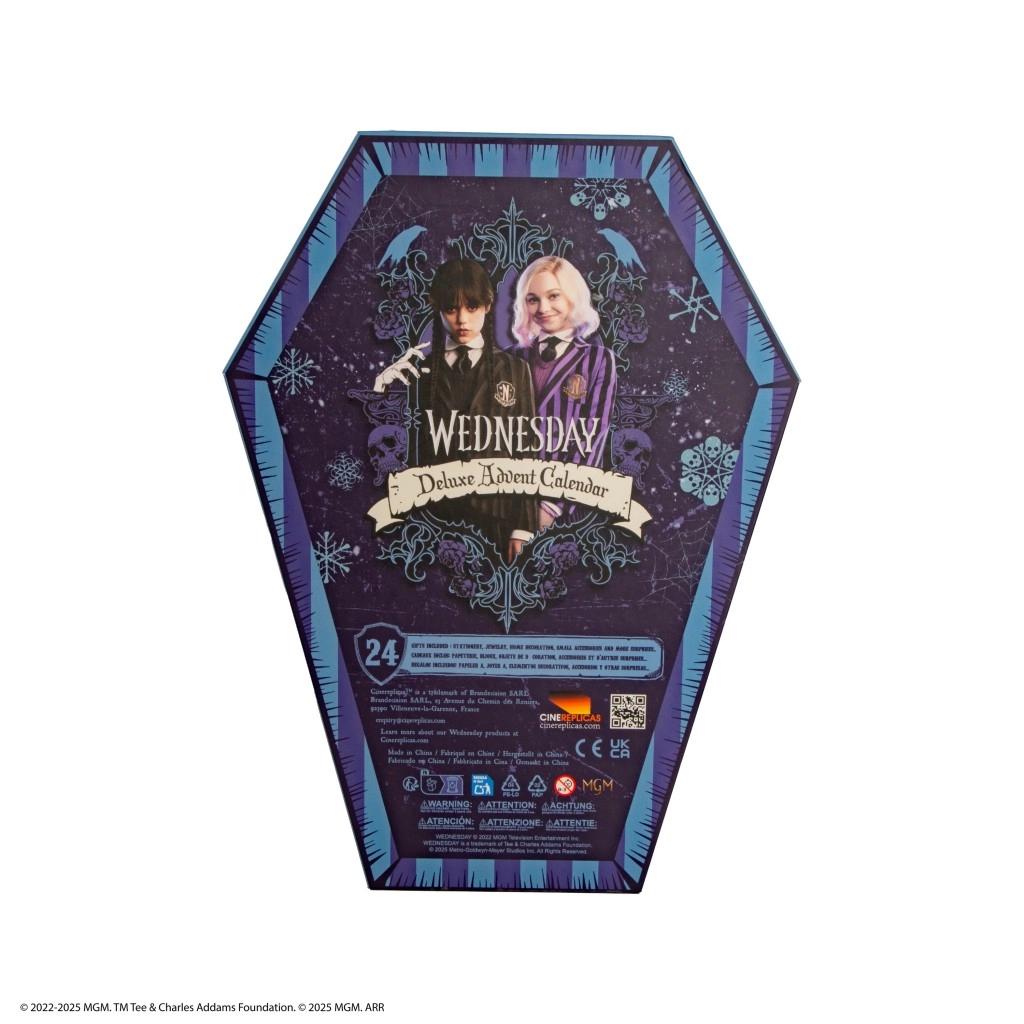 Αυτό το αποκλειστικό ημερολόγιο αντίστροφης μέτρησης σε σχήμα φέρετρου θα ενθουσιάσει κάθε θαυμαστή του WEDNESDAY. Στο εσωτερικό θα βρείτε προσεκτικά σχεδιασμένα διαμερίσματα με 24 θεματικές εκπλήξεις που συνδυάζουν διασκέδαση, πρακτικότητα και συλλεκτική αξία. Χάρη στη συναρπαστική σχεδίαση, το ημερολόγιο είναι ιδανικό και ως διακοσμητικό δώρο για τις γιορτές.