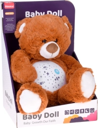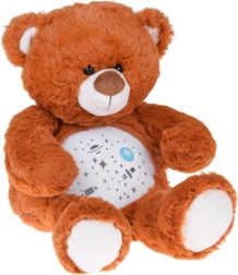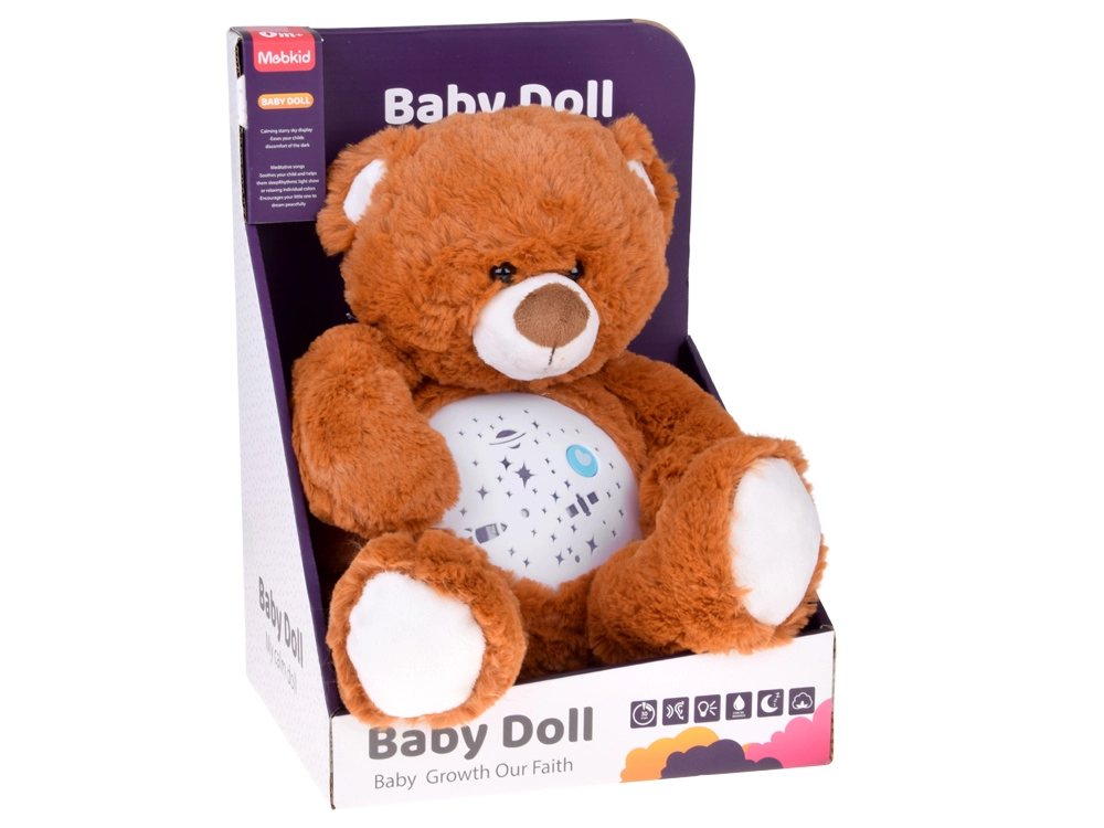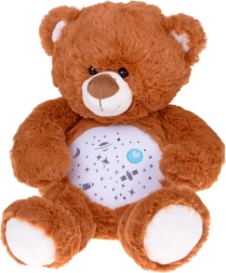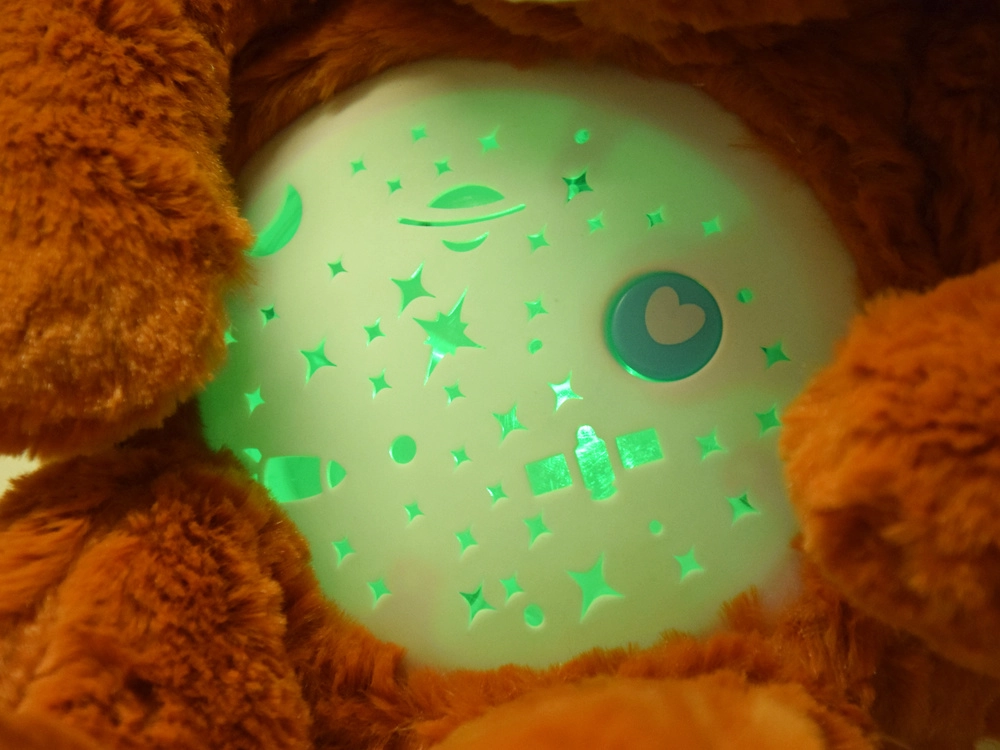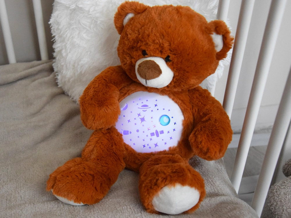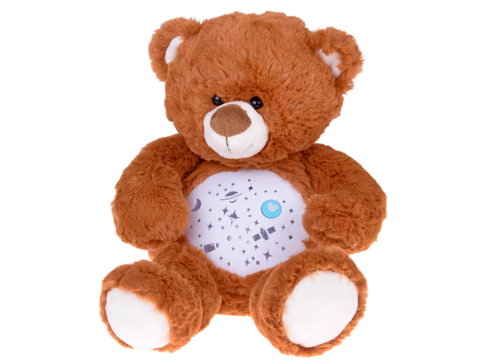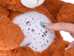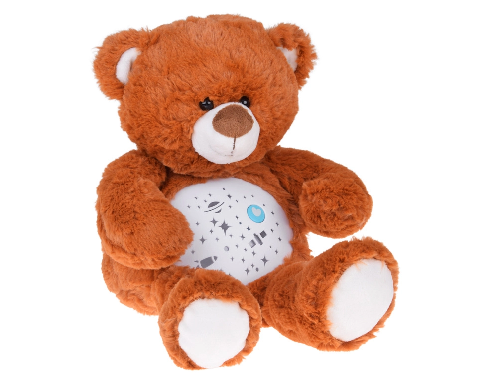 Το λούτρινο αρκουδάκι με προβολέα αστεριών βοηθά τα παιδιά να κοιμούνται πιο γρήγορα και πιο ήρεμα. Από την κοιλίτσα του αρκούδου προβάλλονται αστεράκια, φεγγάρι, πλανήτες και πυραυλάκια, τα οποία συνοδεύονται από χαλαρωτικές μελωδίες και απαλό, μεταβαλλόμενο φως. Χάρη στη διβάθμια ρύθμιση έντασης προσαρμόζετε εύκολα τον ήχο στα ευαίσθητα αυτάκια του μωρού.