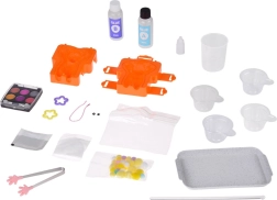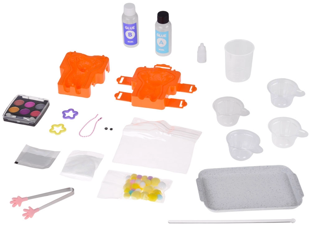 Στο σετ περιλαμβάνονται καλούπι, τσιμπίδα, αναδευτήρας, δοσομετρητής, 2× κόλλα, χρωστική, διακοσμητικά, γάντια καθώς και πρακτικό μπολάκι και δισκάκι για καθαρή κατασκευή. Ο απλός οδηγός καθοδηγεί τα παιδιά βήμα-βήμα – από την ανάμιξη του υλικού έως τη τελική διακόσμηση και την ανάρτηση.