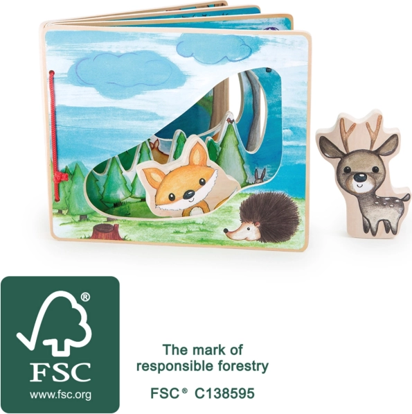 Μπείτε στο βαθύ δάσος με το διαδραστικό ξύλινο βιβλιαράκι που ενισχύει τη φαντασία των παιδιών. Χάρη στις φιγούρες της αλεπούς και του ελαφιού, που βοηθούν στην ανακάλυψη της χλωρίδας και της πανίδας, κάθε παιχνίδι γίνεται μια μοναδική εμπειρία.