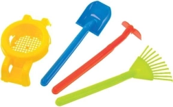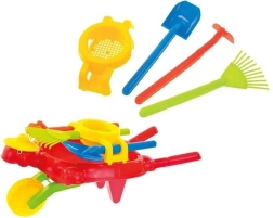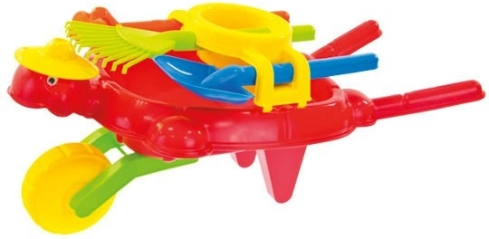 Ο μεγάλος, κινούμενος τροχός εξασφαλίζει ομαλή και σταθερή κίνηση σε διάφορες επιφάνειες, ενώ τα διπλά στηρίγματα επιτρέπουν το ασφαλές άφημα του καροτσιού. Οι εργονομικές λαβές είναι προσαρμοσμένες στις παιδικές παλάμες και υποστηρίζουν σταθερό κράτημα. Στη συσκευασία θα βρείτε χρήσιμα αξεσουάρ: τσουγκράνα, φτυαράκι, τσάπα και κόσκινο – ιδανικά για μεταφορά χώματος, μάζεμα φύλλων ή κοσκίνισμα άμμου.