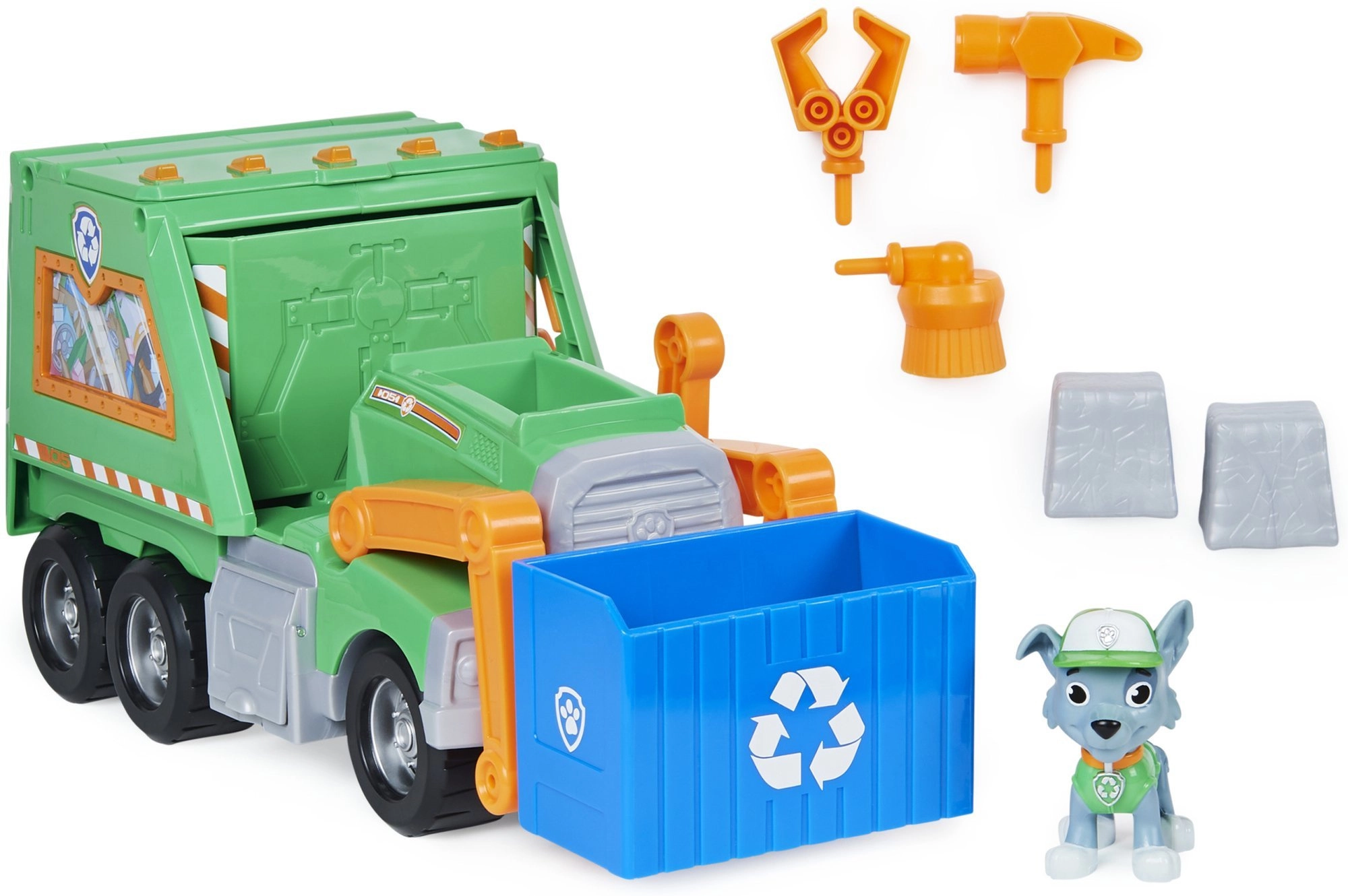 - Ανακυκλωτικό όχημα, φιγούρα Rocky, μπλε κάδος, αξεσουάρ παιχνιδιού («σκουπίδια» και εργαλεία)