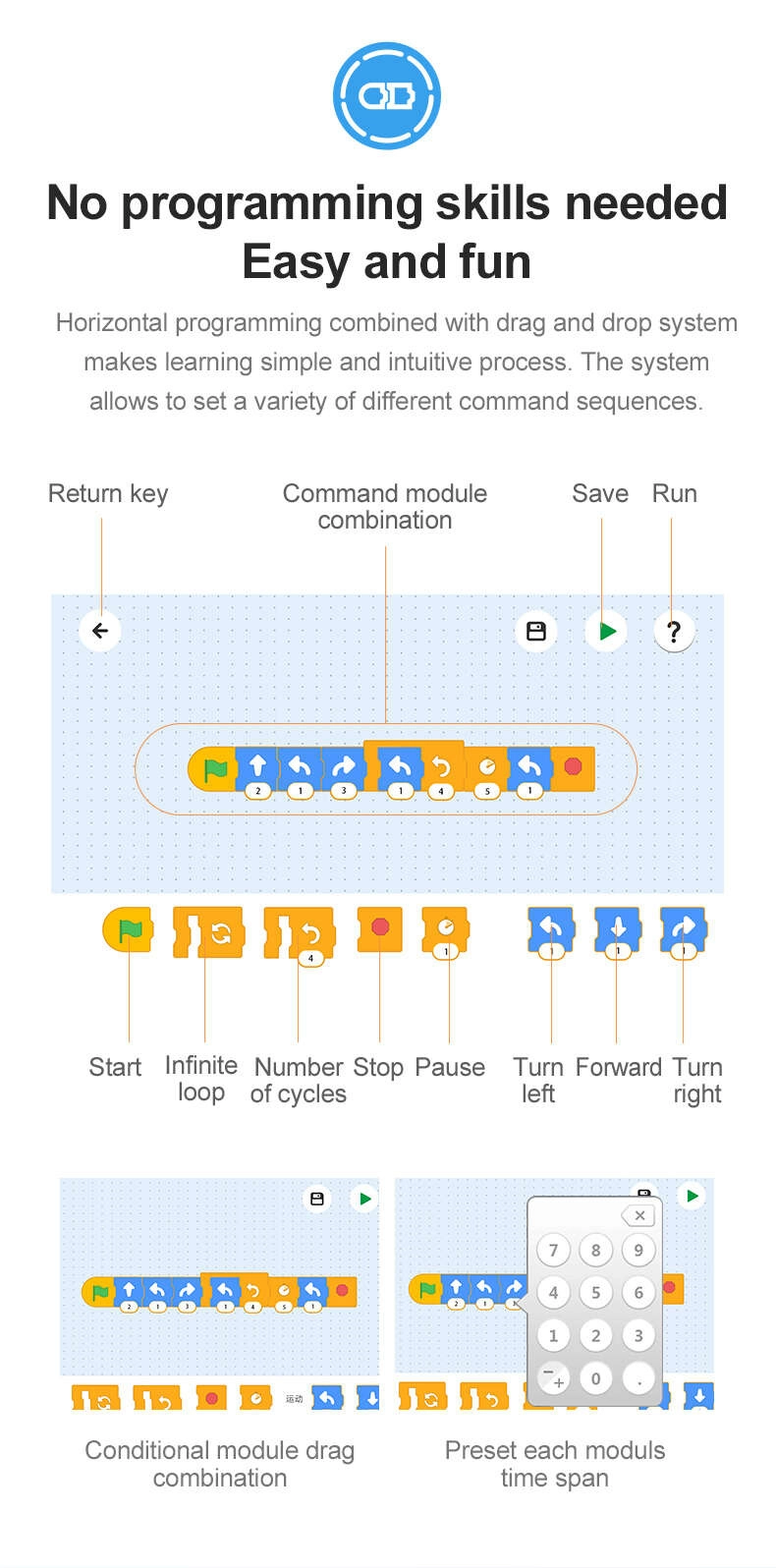 Η λειτουργία Dual Mode επιτρέπει έλεγχο με δύο τρόπους: μέσω τηλεχειριστηρίου 2,4 GHz (ομαλή κίνηση εμπρός/πίσω και στροφή) ή μέσω κινητής εφαρμογής Bluetooth με εμβέλεια άνω των 25 m. Στην εφαρμογή θα βρείτε 4 λειτουργίες ελέγχου – από το κλασικό χειριστήριο έως γυροσκοπικό έλεγχο και προγραμματισμό διαδρομής. Αυτό καλλιεργεί τη δημιουργικότητα, τη φαντασία και τις τεχνικές δεξιότητες.