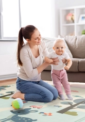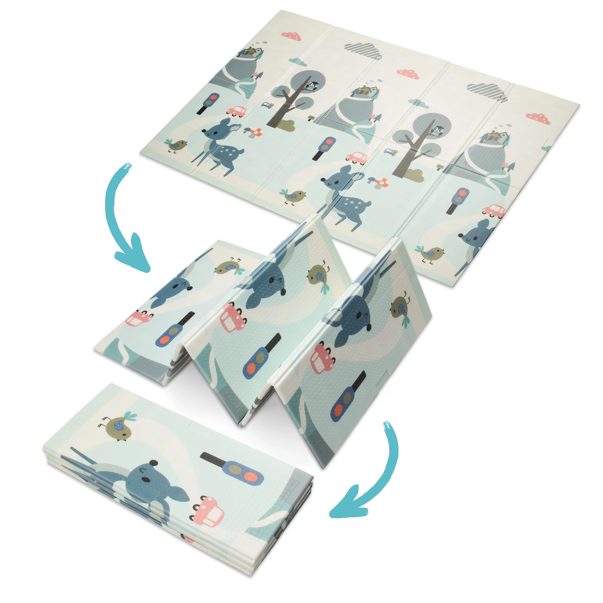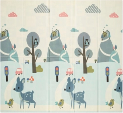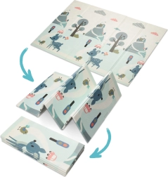 Ο ποιοτικός αφρός XPE εξασφαλίζει εξαιρετική απορρόφηση κραδασμών, θερμική μόνωση από το κρύο πάτωμα και μεγάλη αντοχή. Και οι δύο πλευρές έχουν διαφορετικές, εκπαιδευτικές εκτυπώσεις – ένα απαλό «δασικό μονοπάτι» με χαριτωμένα ζωάκια και έντονα μοτίβα για οπτική διέγερση των μικρών. Χάρη στη αντιολισθητική υφή είναι ιδανικό για ασφαλές παιχνίδι, tummy-time και εξάσκηση στο μπουσούλημα και το περπάτημα.