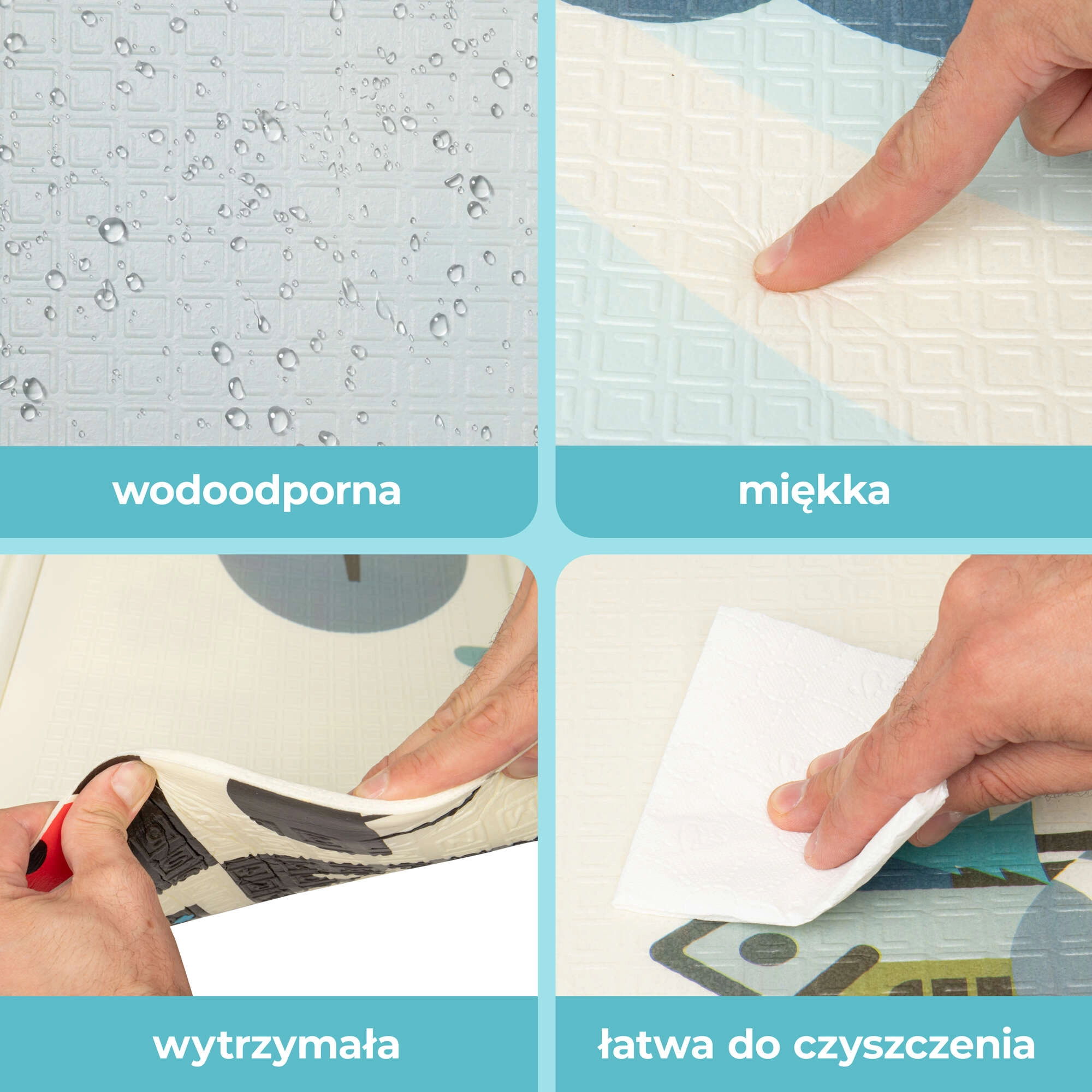 Η παχιά στρώση 1 cm XPE απορροφά εξαιρετικά τους κραδασμούς, μονώνει από το κρύο και είναι άοσμη και χωρίς επιβλαβείς ουσίες. Ιδανικό για παιχνίδι, μπουσούλημα και τα πρώτα βήματα.