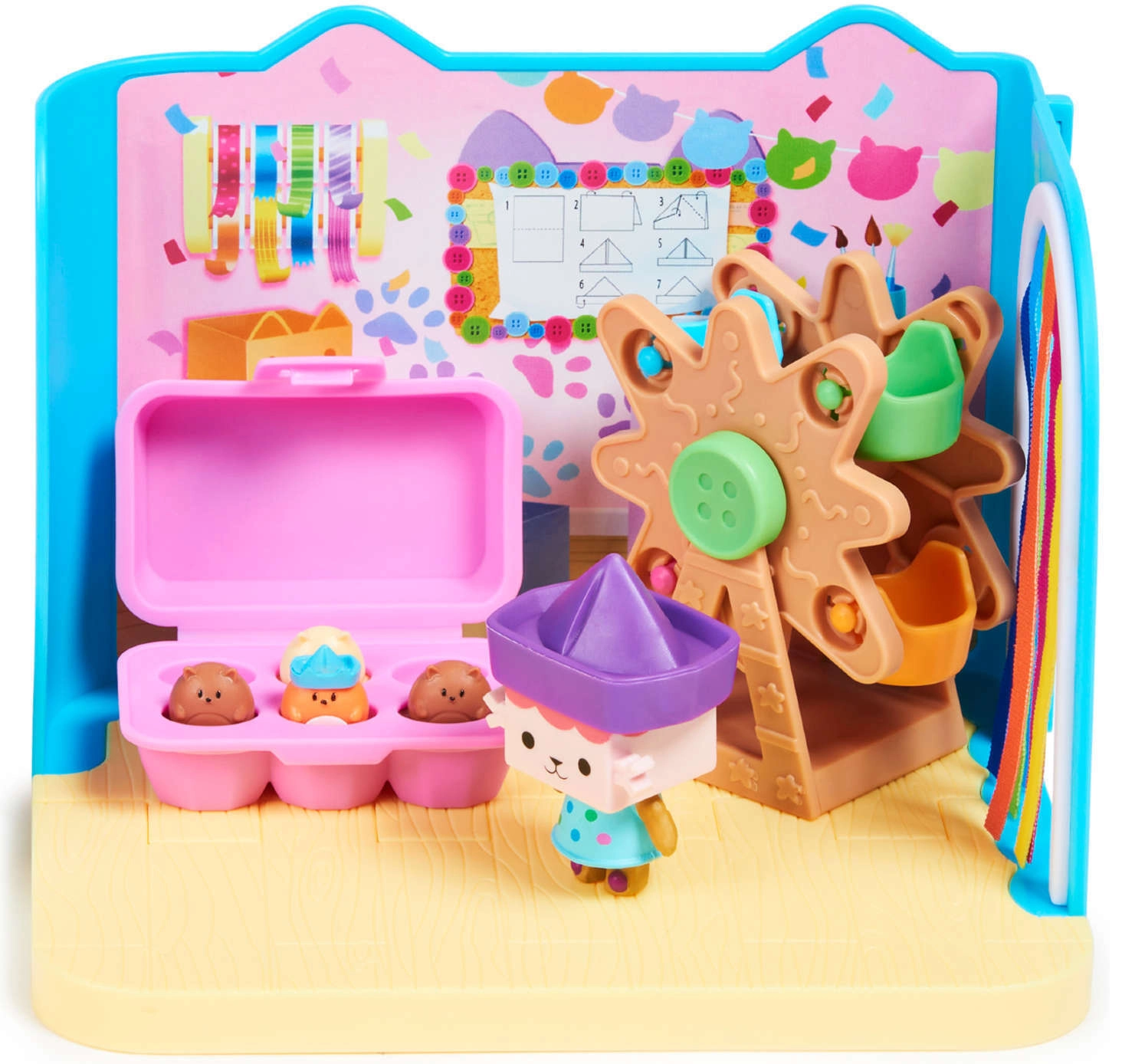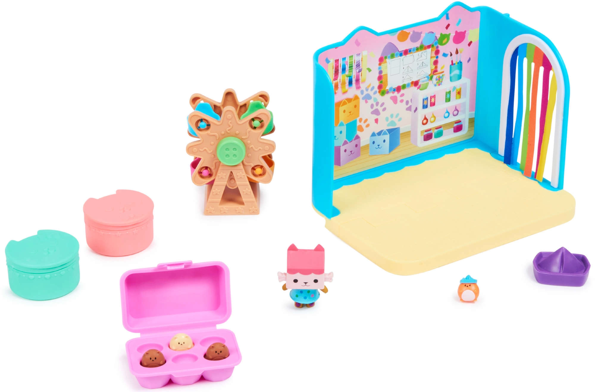 Το σετ «Baby Box Craft-a-riffic Room» είναι μια αυθεντική προσθήκη στο σύστημα παιχνιδιού Gabby’s Dollhouse – μπορεί να χρησιμοποιηθεί αυτόνομα ή να συνδεθεί με το μεγάλο κουκλόσπιτο.