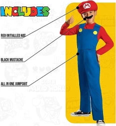 Ανακαλύψτε την αυθεντική παιδική στολή Super Mario από τη μάρκα Disguise – επίσημα αδειοδοτημένο προϊόν από το αγαπημένο παιχνίδι SUPER MARIO. Ιδανική για αποκριάτικο πάρτι, μασκέ και παιχνίδι στο σπίτι. Περιλαμβάνει κόκκινη-μπλε ολόσωμη φόρμα με κίτρινα κουμπιά, καπέλο και μουστάκι. Μέγεθος για παιδιά 10–12 ετών, ύψος 137–149 cm. Υλικό 100% πολυεστέρας για εύκολη φροντίδα και άνετη εφαρμογή.
