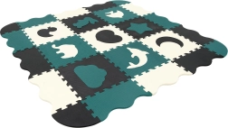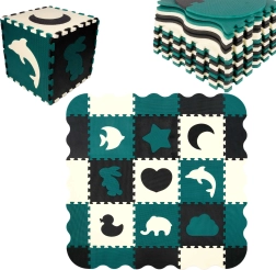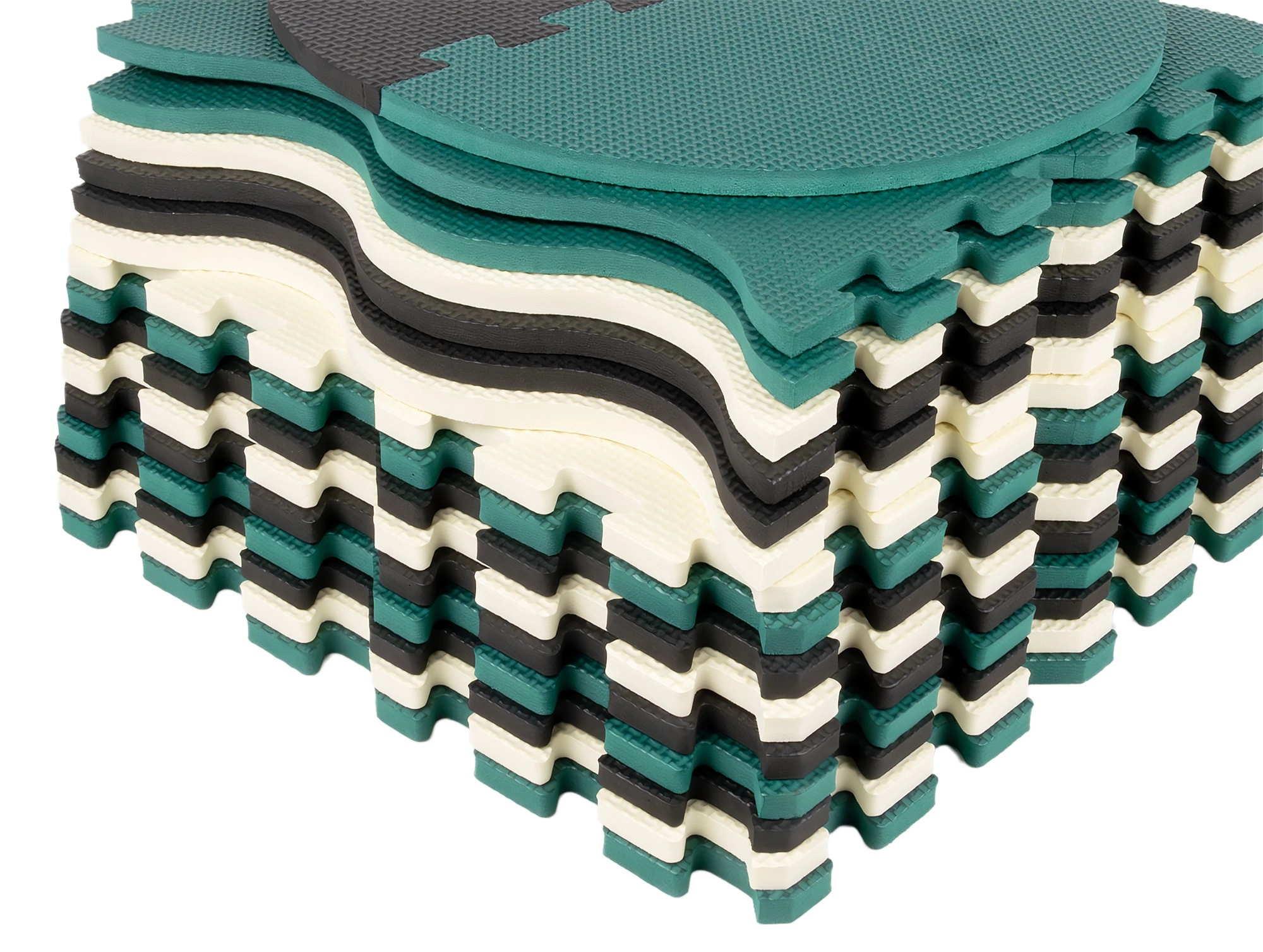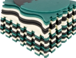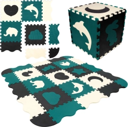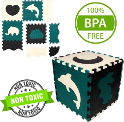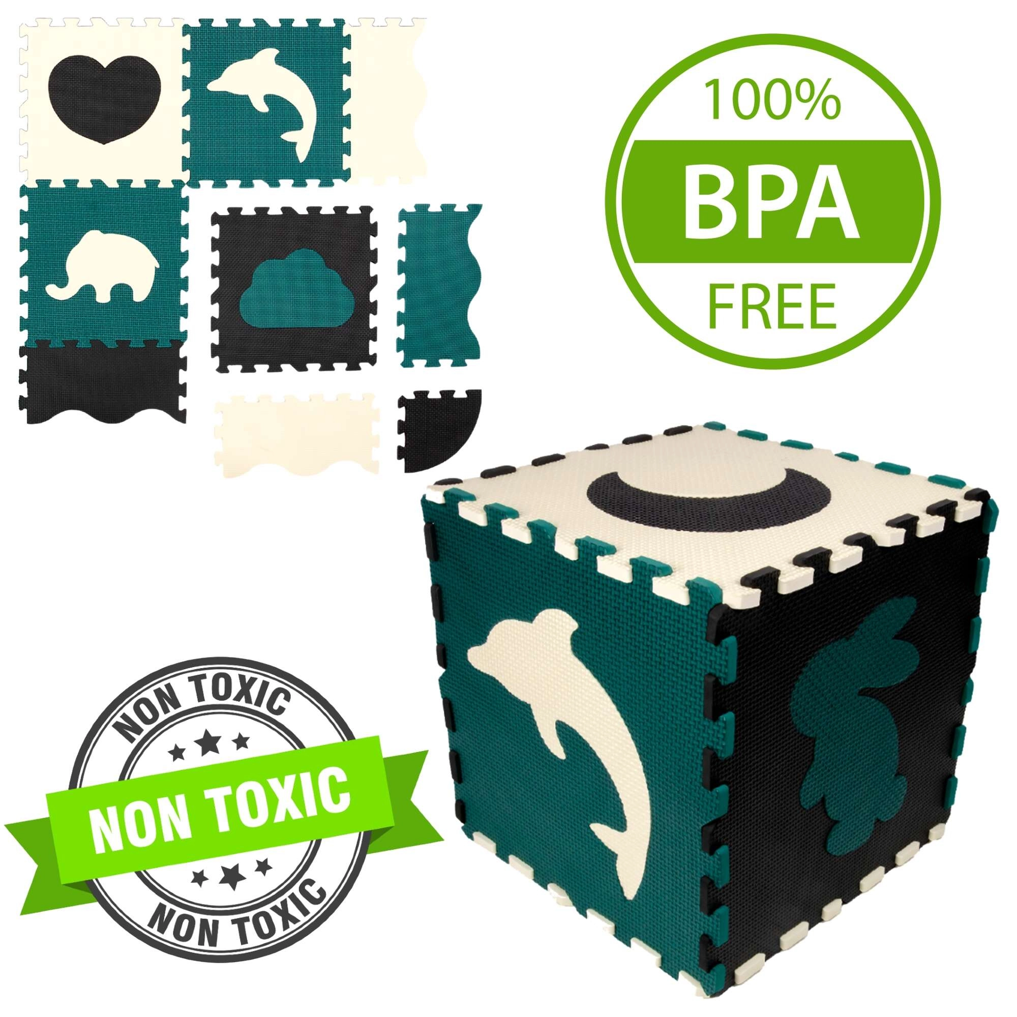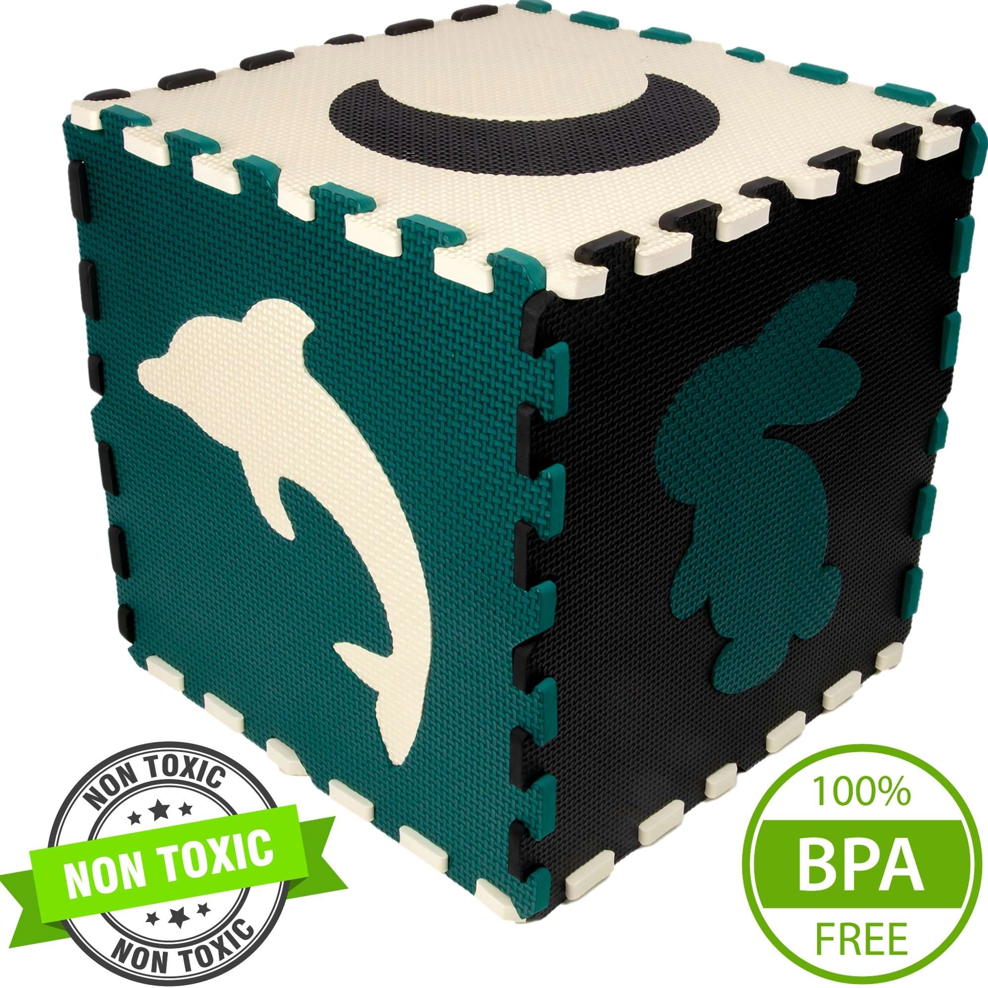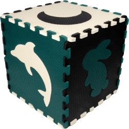 Τα κομμάτια λειτουργούν επίσης ως 3D παζλ – τα αφαιρούμενα μοτίβα ζώων και σχημάτων μπορούν να ενωθούν και να συναρμολογηθούν σε τρισδιάστατα αντικείμενα (π.χ. κύβος), ενισχύοντας χωρική αντίληψη, λαβή και συντονισμό. Το υλικό EVA είναι χωρίς φθαλικές ενώσεις, φορμαμίδη, BPA και PVC, πληροί τα πρότυπα EN 71 και REACH και φέρει σήμανση CE.