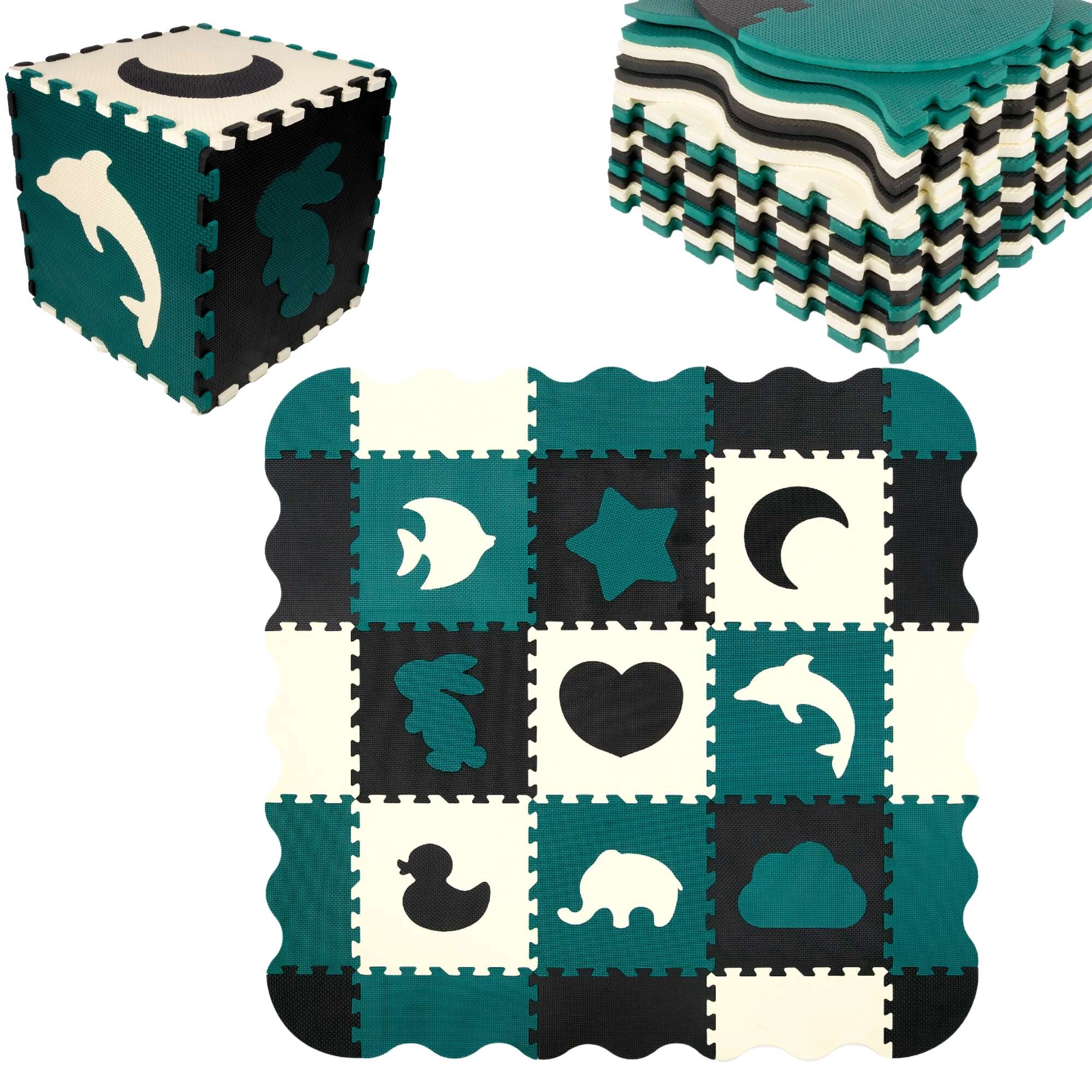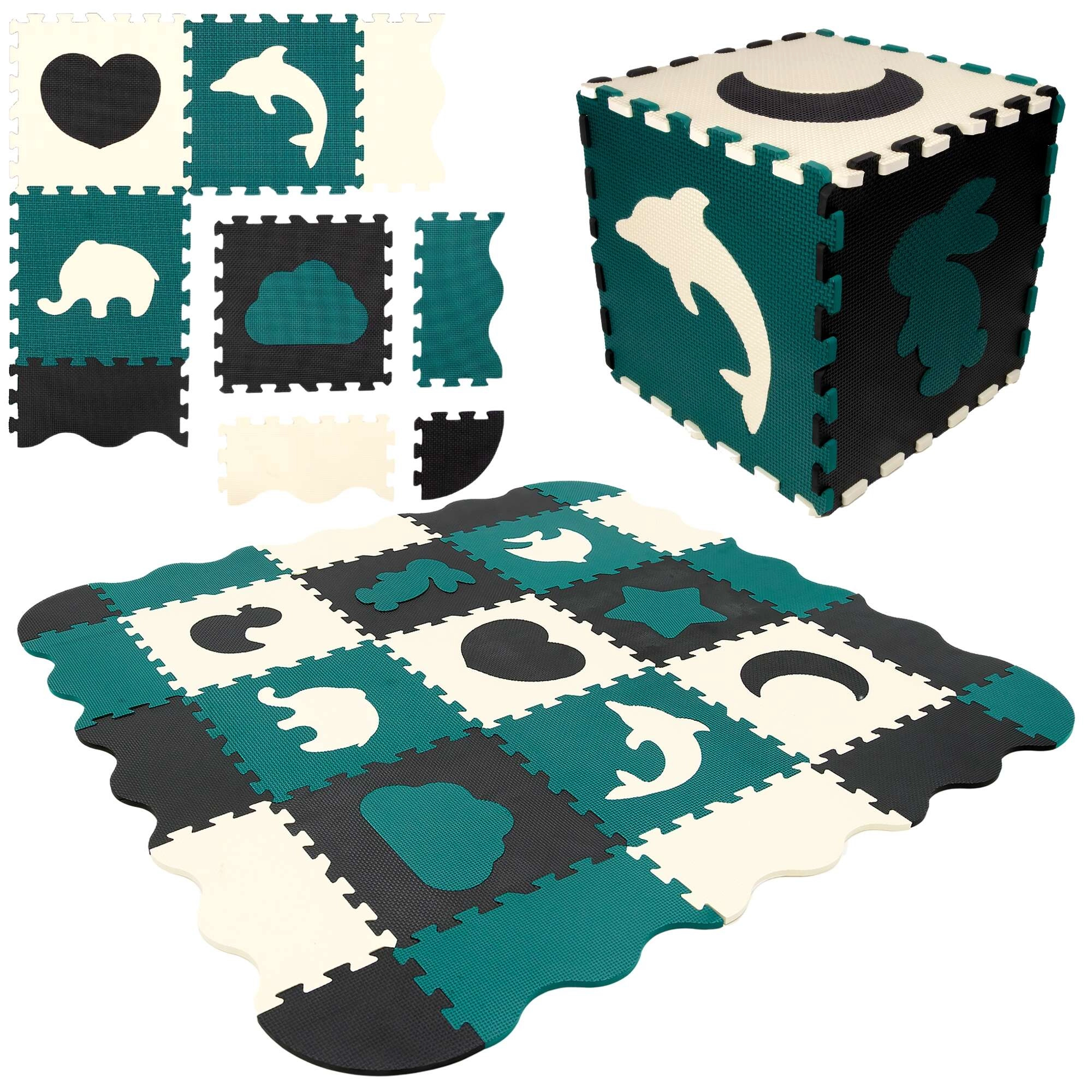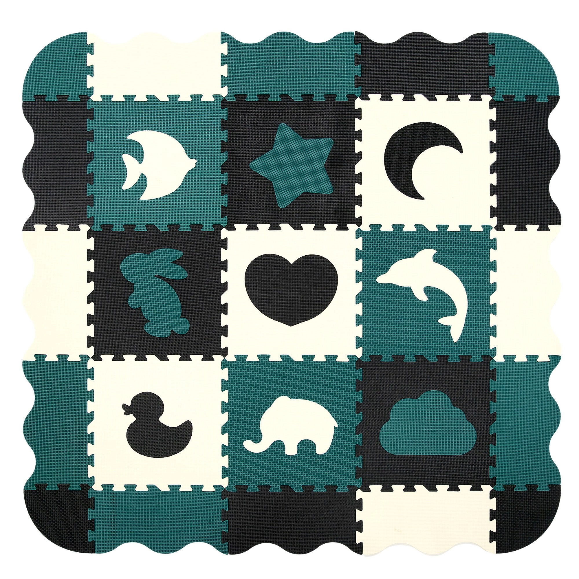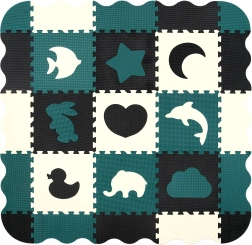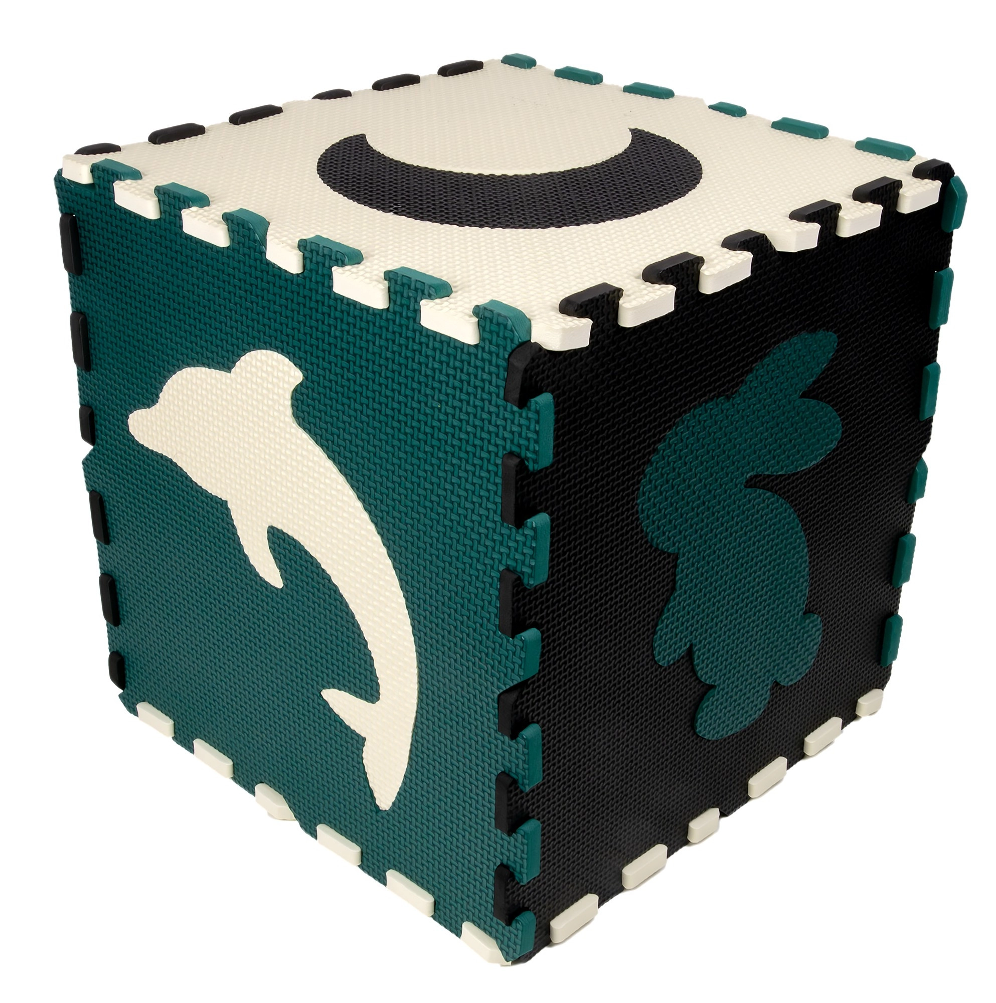Τα κομμάτια λειτουργούν επίσης ως 3D παζλ – τα αφαιρούμενα μοτίβα ζώων και σχημάτων μπορούν να ενωθούν και να συναρμολογηθούν σε τρισδιάστατα αντικείμενα (π.χ. κύβος), ενισχύοντας χωρική αντίληψη, λαβή και συντονισμό. Το υλικό EVA είναι χωρίς φθαλικές ενώσεις, φορμαμίδη, BPA και PVC, πληροί τα πρότυπα EN 71 και REACH και φέρει σήμανση CE.