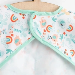 Το κλείσιμο με αυτοκόλλητο (Velcro) διευκολύνει το γρήγορο φόρεμα και βγάλσιμο, ενώ η μαλακή μπροστινή τσέπη συγκρατεί ψίχουλα και σταγόνες. Η σαλοπέτα είναι ιδανική για ταΐσμα, αυτόνομο φαγητό και δημιουργικές δραστηριότητες. Τα μοντέρνα σχέδια και το πράσινο χρώμα θα ευχαριστήσουν παιδιά και γονείς.