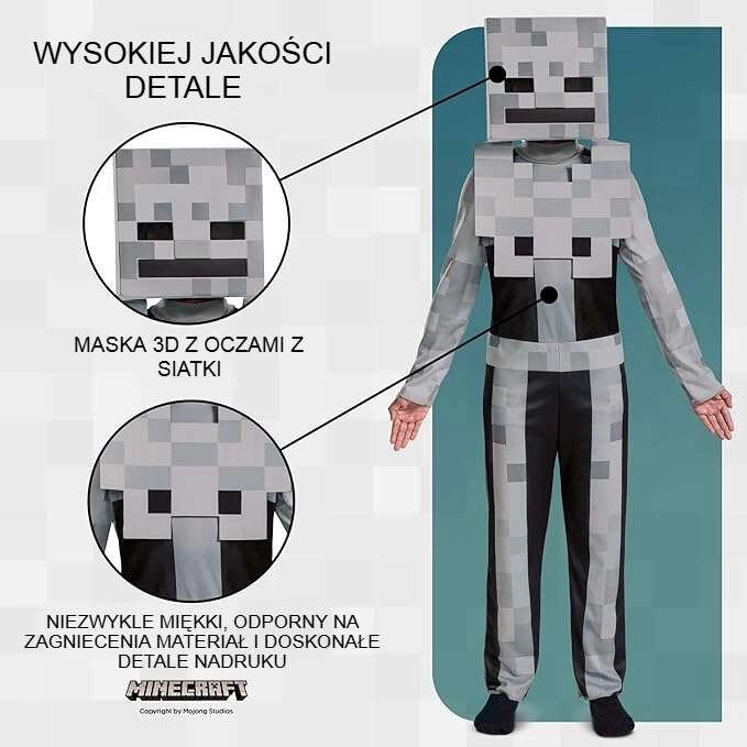 Μεταμορφώστε τον μικρό σας παίκτη σε έναν τρομερό αντίπαλο από τον κόσμο του Minecraft! Η στολή Skeleton στη λευκή εκδοχή αποδίδει πιστά την εμφάνιση του χαρακτήρα του παιχνιδιού και είναι εξαιρετική επιλογή για σχολικό καρναβάλι, μασκέ πάρτι και θεματικές γιορτές. Χάρη στο ελαφρύ υλικό, φοριέται άνετα και επιτρέπει ελευθερία κινήσεων στο παιχνίδι.