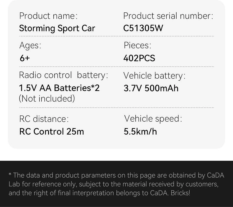 Το σπορ αυτοκίνητο CaDA ξεχωρίζει για τις ρεαλιστικές αναλογίες, την στιβαρή κατασκευή και το ελκυστικό λευκό αμάξωμα με μαύρα στοιχεία. Χάρη στους κινητήρες και το ακριβές τιμόνι θα απολαύσετε ομαλή κίνηση εμπρός/πίσω και ακριβές στρίψιμο. Το Dual Mode επιτρέπει τον χειρισμό με κλασικό τηλεχειριστήριο ή με έξυπνο τηλέφωνο μέσω Bluetooth – διασκέδαση στο σπίτι και έξω.
