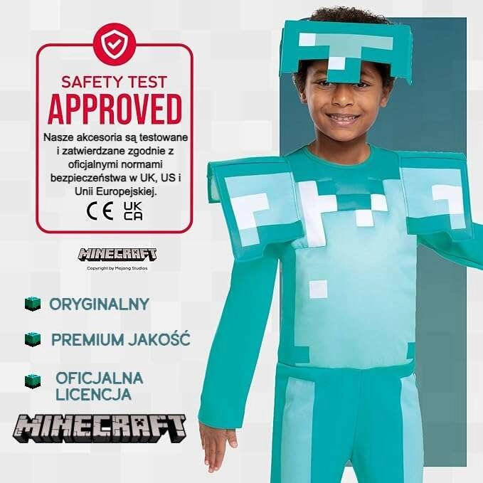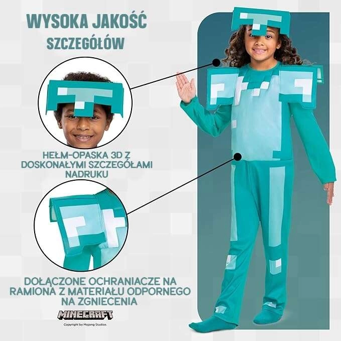 Αυτή η επίσημα αδειοδοτημένη στολή MINECRAFT διαμαντένιας πανοπλίας μεταμορφώνει τα παιδιά σε ήρωες του αγαπημένου τους παιχνιδιού. Η μαλακή ολόσωμη στολή με pixel τύπωμα και έντονες επωμίδες συμπληρώνεται από ελαφρύ κράνος που χαρίζει εμβληματική εμφάνιση. Χάρη στα ευχάριστα υλικά, η στολή είναι άνετη ακόμη και σε παρατεταμένη χρήση.