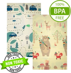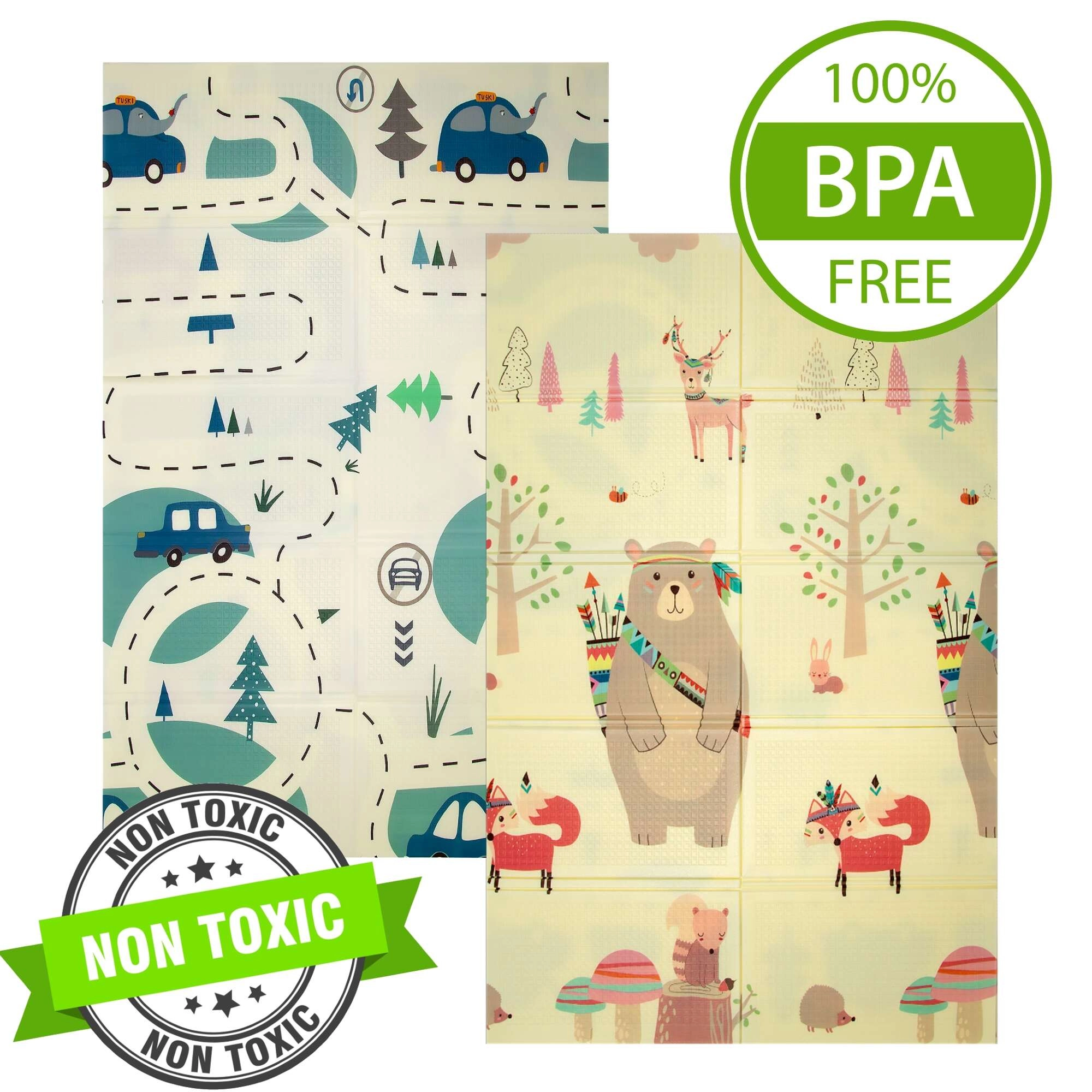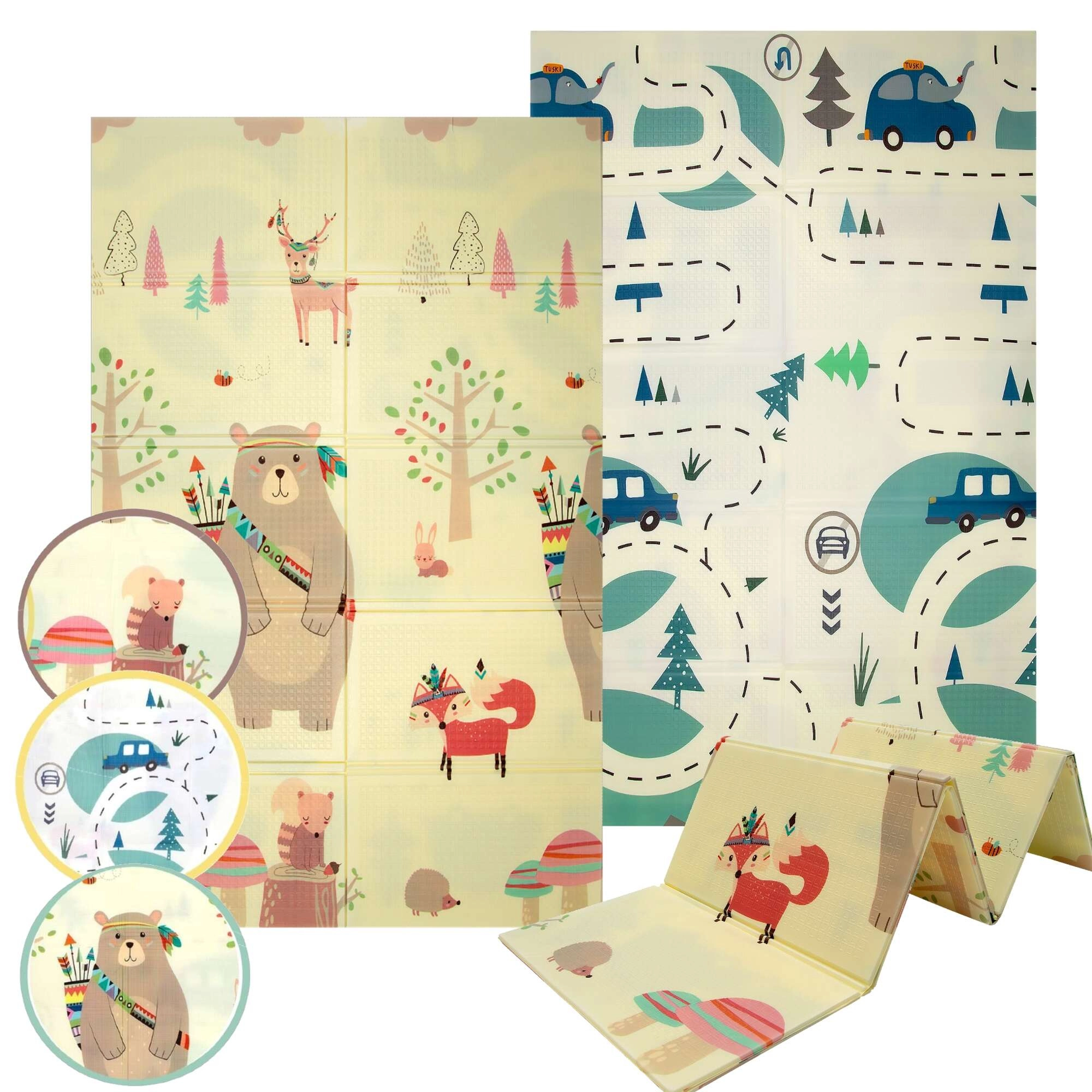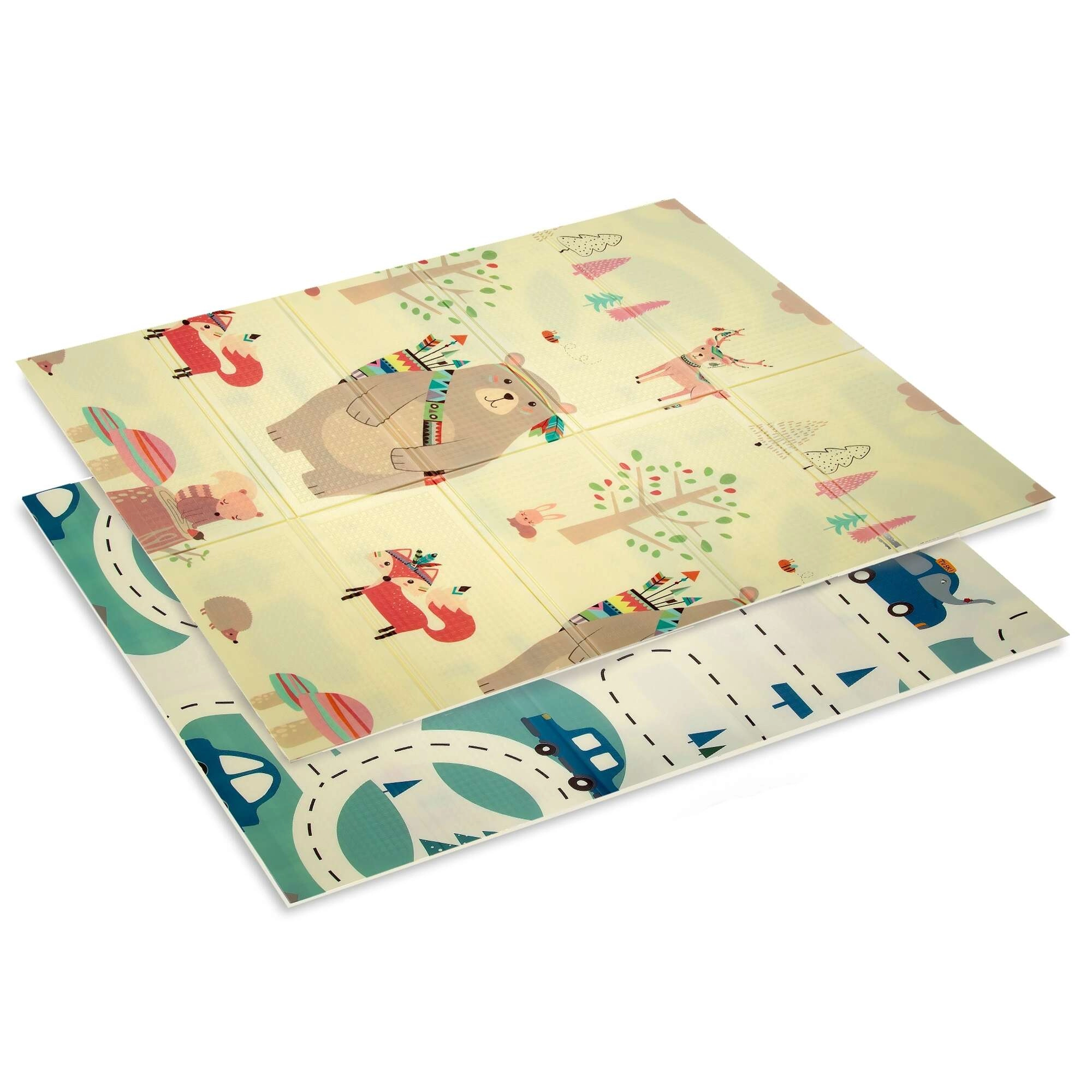 Το χαλάκι HUMBI προσφέρει στα παιδιά ένα μαλακό και ασφαλές μέρος για παιχνίδι, ξεκούραση και ανάπτυξη κινητικών δεξιοτήτων. Ο ποιοτικός αφρός XPE είναι ανθεκτικός, απορροφά τους κραδασμούς και ταυτόχρονα μονώνει εξαιρετικά το κρύο από το πάτωμα. Ο διπλής όψης σχεδιασμός διαθέτει στη μία πλευρά χαριτωμένα δασικά μοτίβα (αρκουδάκια, αλεπούδες, σκαντζόχοιροι) και στην άλλη πλευρά δρόμο με αυτοκινητάκια για διασκεδαστική οδήγηση και αισθητηριακή εξερεύνηση.