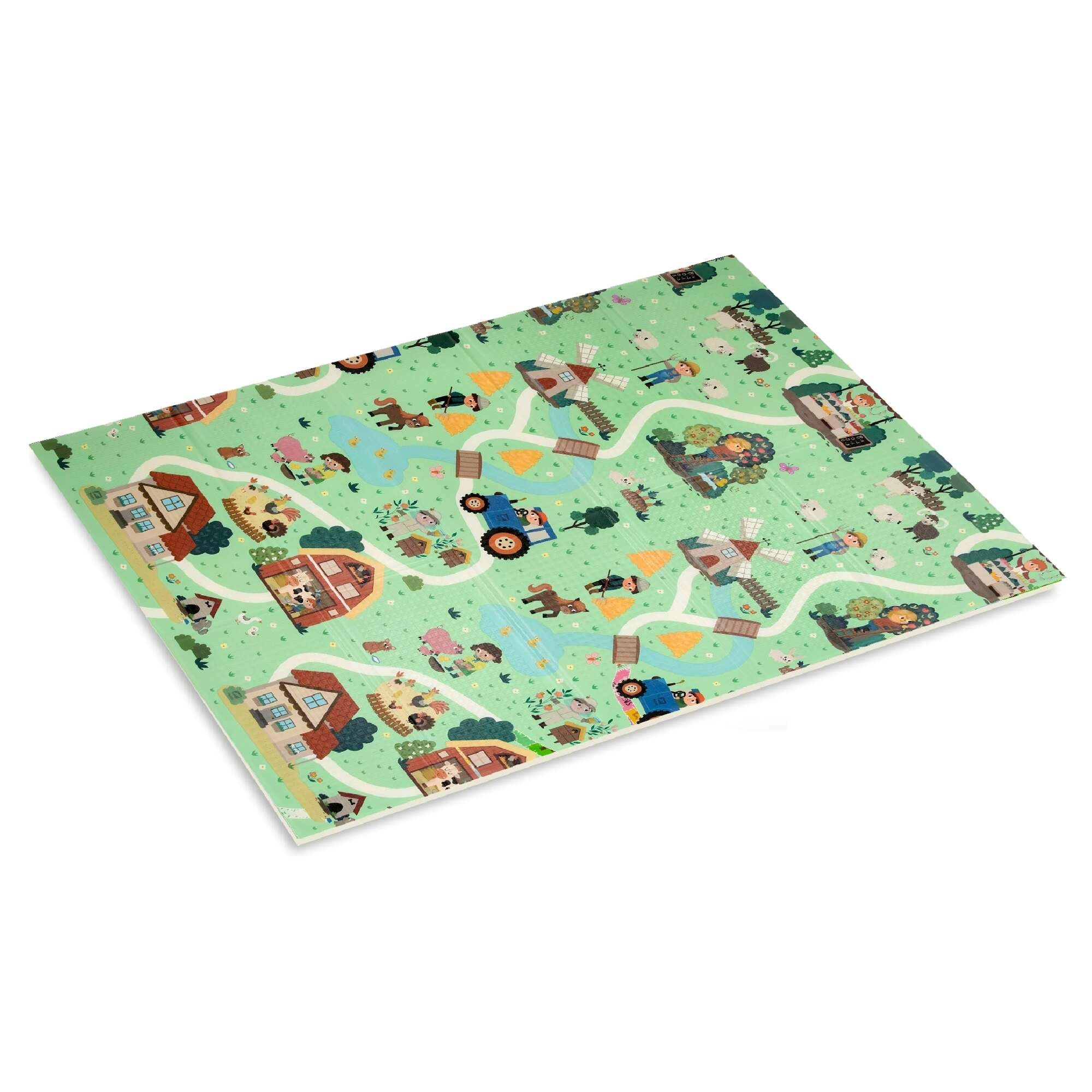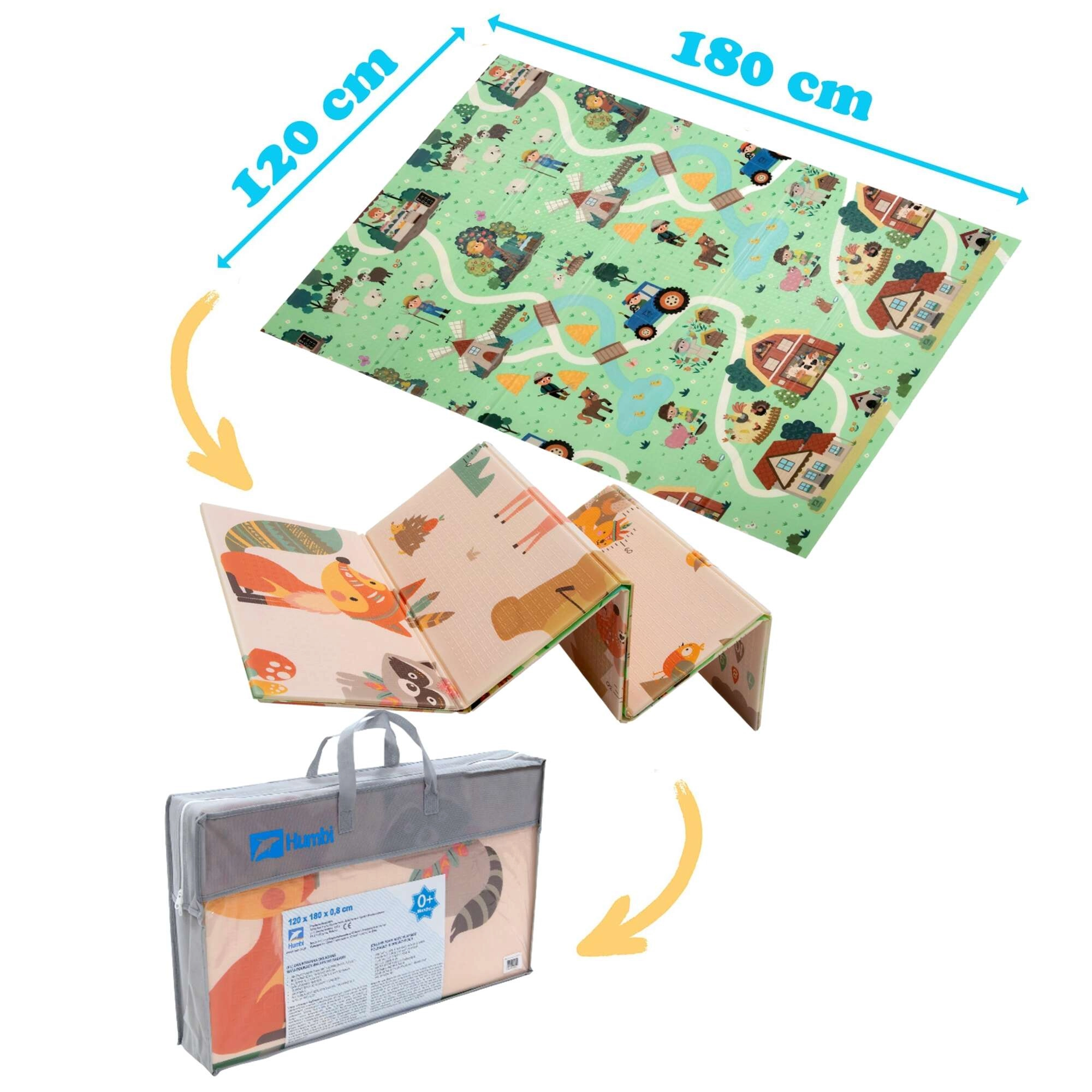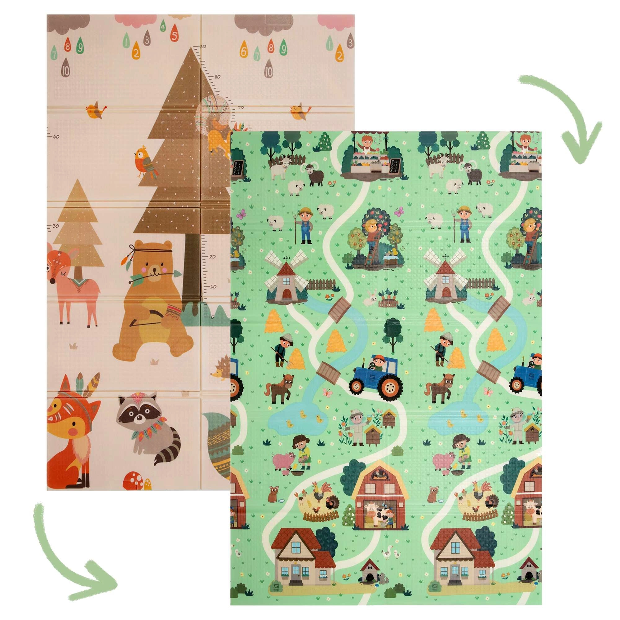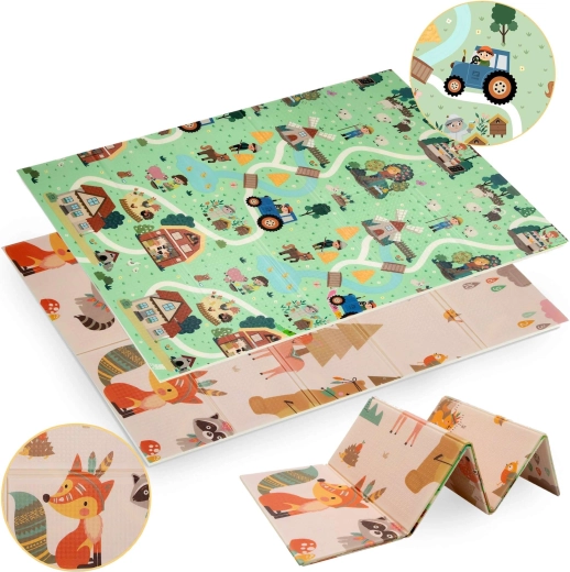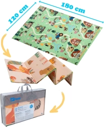 Η μία πλευρά απεικονίζει ζωάκια του δάσους, η άλλη ένα χωριό με δρόμους για αυτοκινητάκια. Εναλλάσσετε τα μοτίβα ανάλογα με τη διάθεση και ενισχύετε τη φαντασία και την αισθητηριακή αντίληψη.