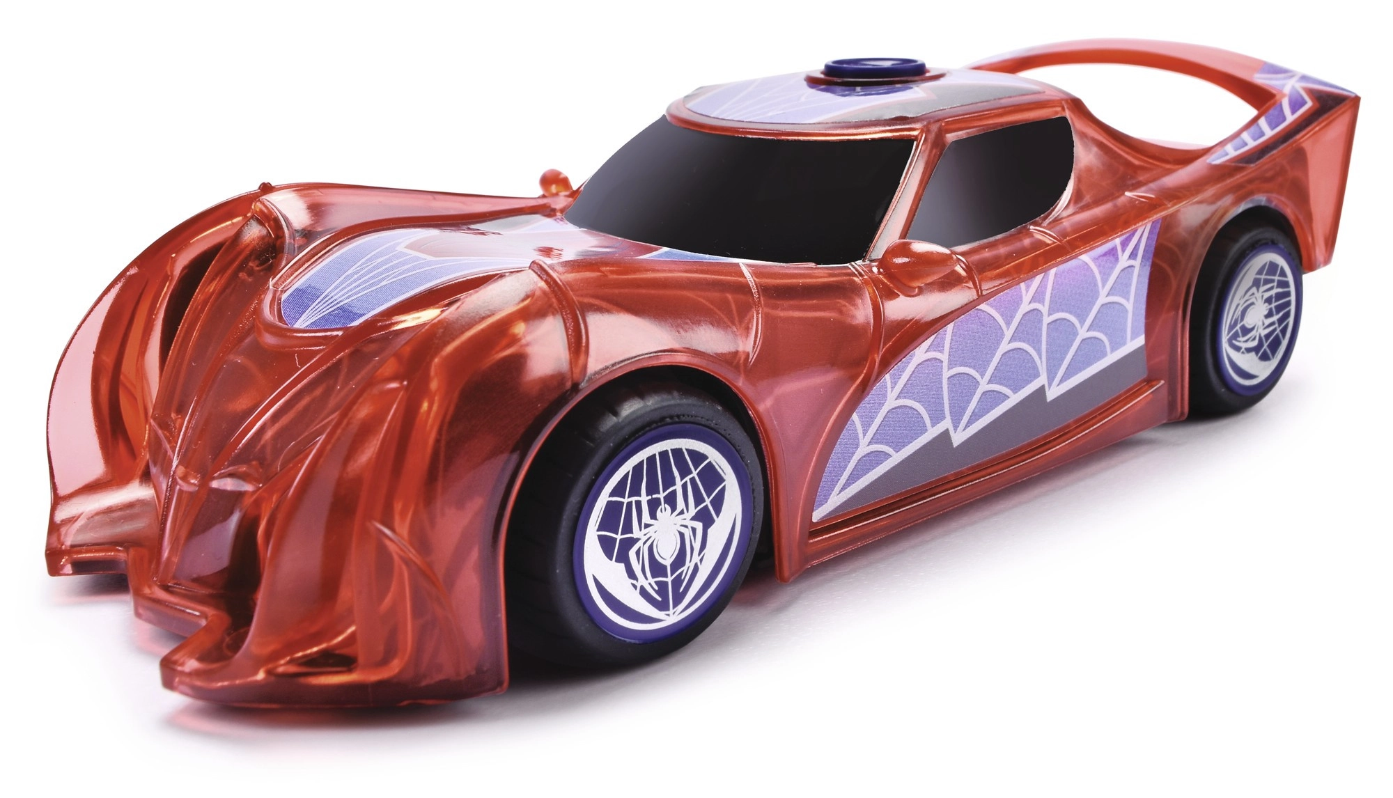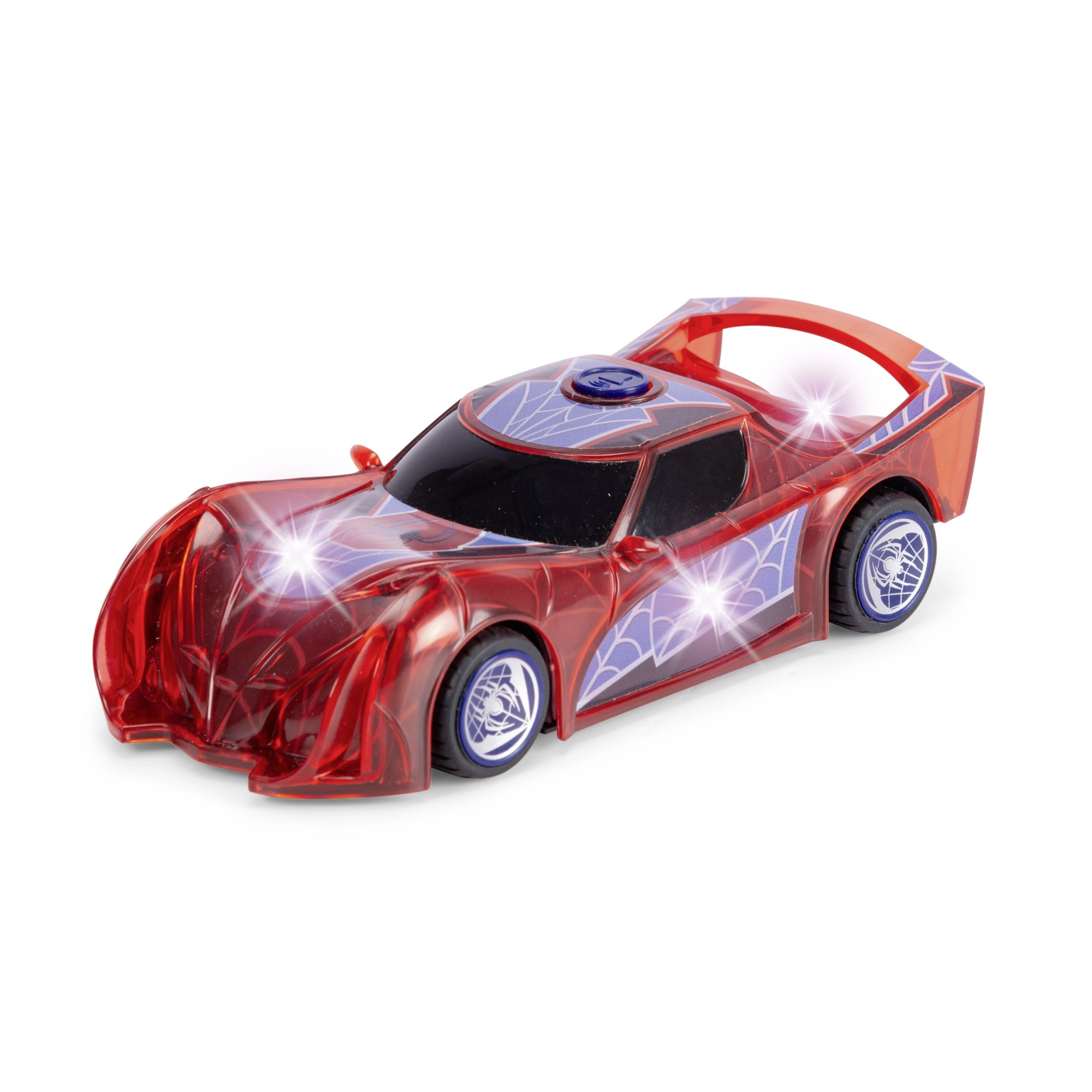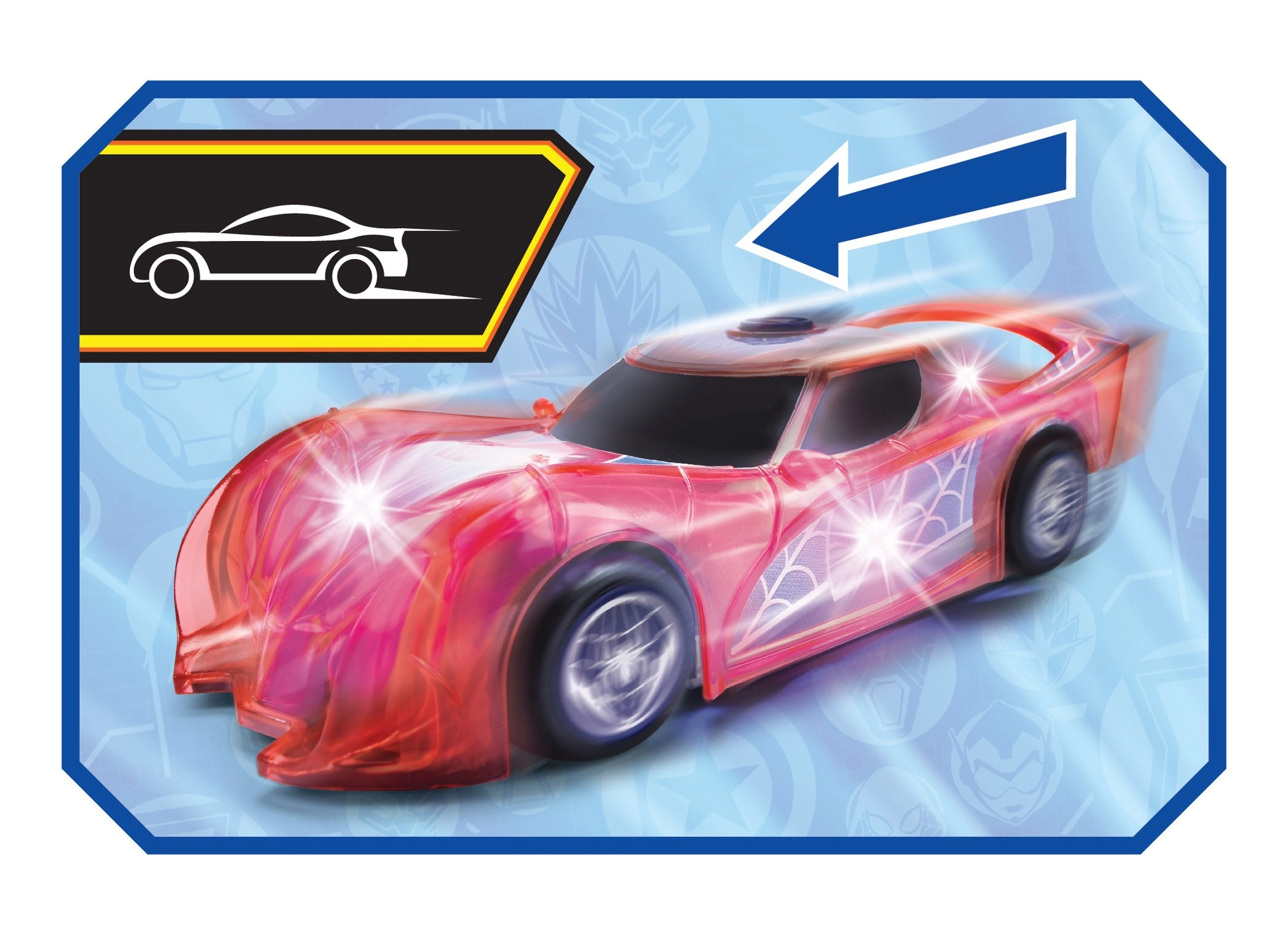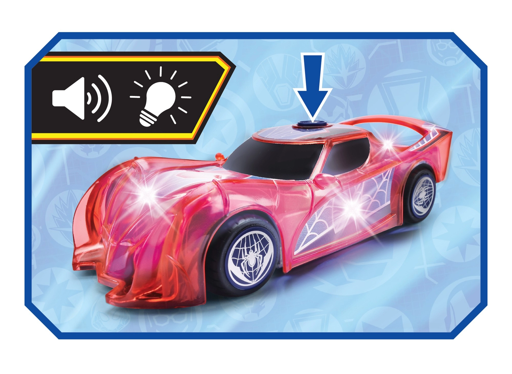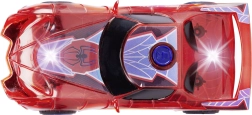 Το σούπερ‑ηρωικό αυτοκίνητο SPIDER‑MAN στη χαρακτηριστική κόκκινη απόχρωση και με λεπτομέρειες ιστού ξεχωρίζει με τον ημιδιαφανή σχεδιασμό και τα ενσωματωμένα LED φώτα που φωτίζουν κάθε περιπέτεια. Ο απλός μηχανισμός push‑and‑go (τριβική κίνηση) χρειάζεται μόνο ένα ελαφρύ σπρώξιμο για να ξεκινήσει μπροστά.