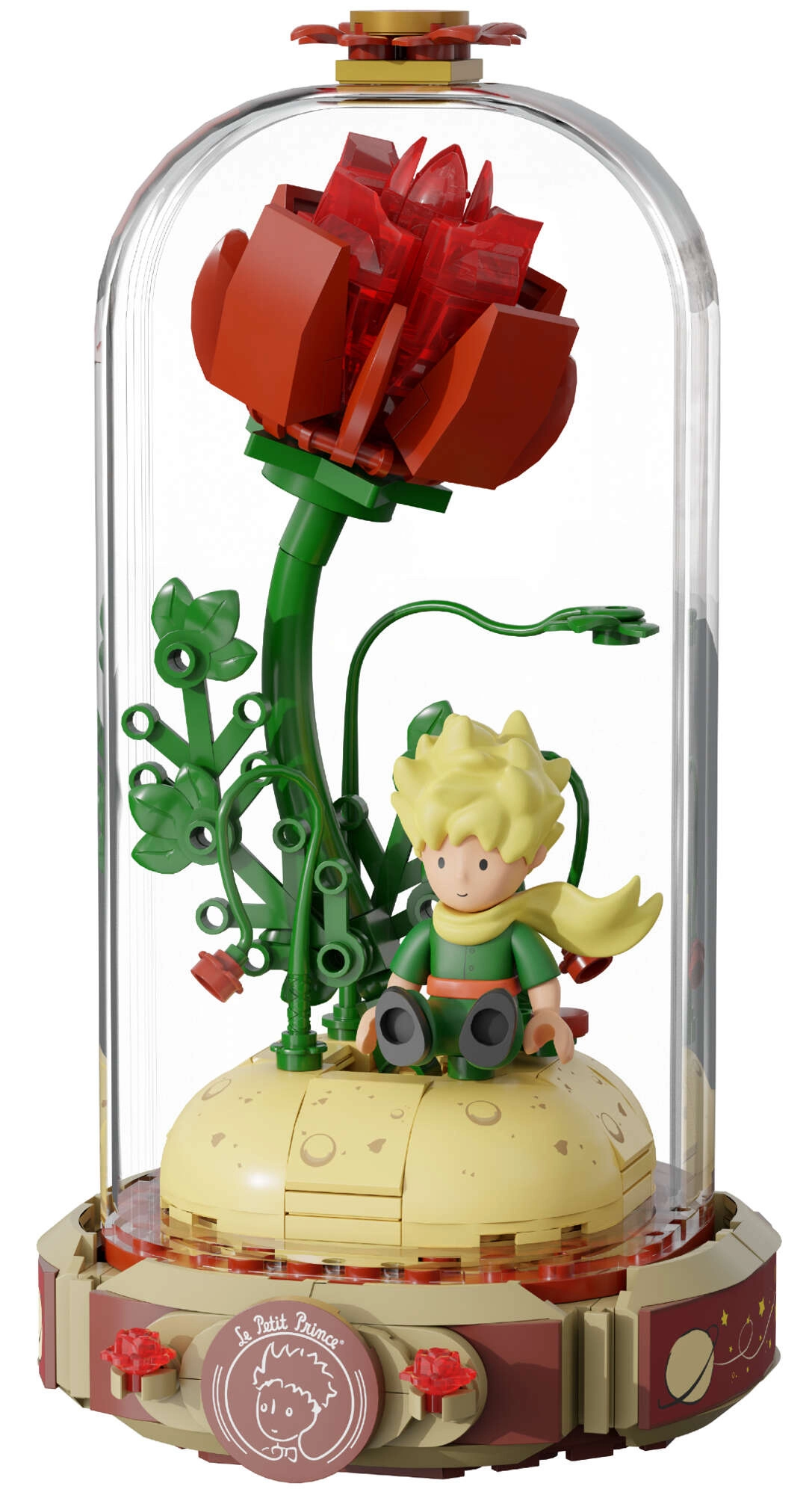 Συναρμολογήστε το συμβολικό κόκκινο τριαντάφυλλο σε βάθρο με σχήμα ανοιχτού βιβλίου με την επιγραφή «Le Petit Prince». Δίπλα στέκονται ο Μικρός Πρίγκιπας και η αλεπού στη χαρακτηριστική τους πόζα. Οι προσεγμένες λεπτομέρειες σε κοτσάνι, φύλλα και άνθη χαρίζουν αρμονία και κομψότητα στο μοντέλο – ιδανικό για έκθεση και δημιουργική διασκέδαση.
