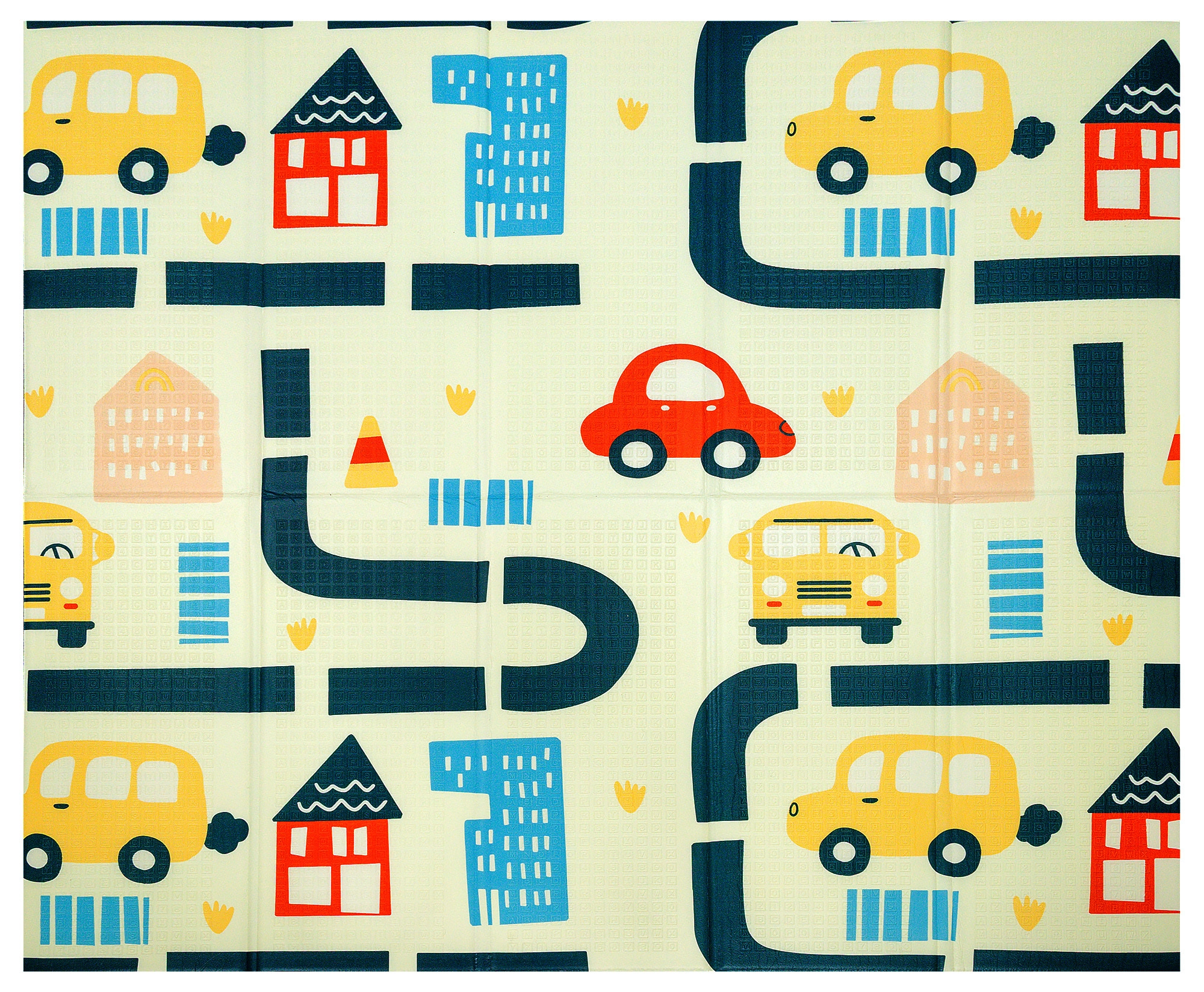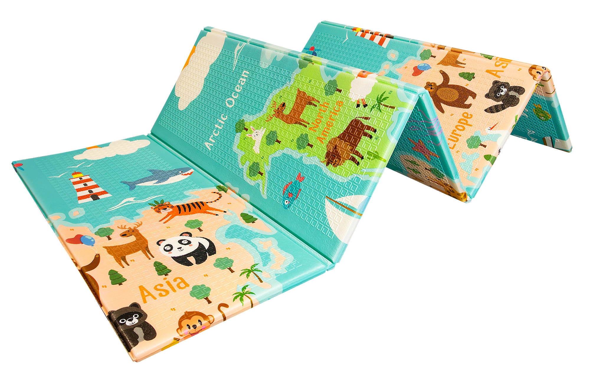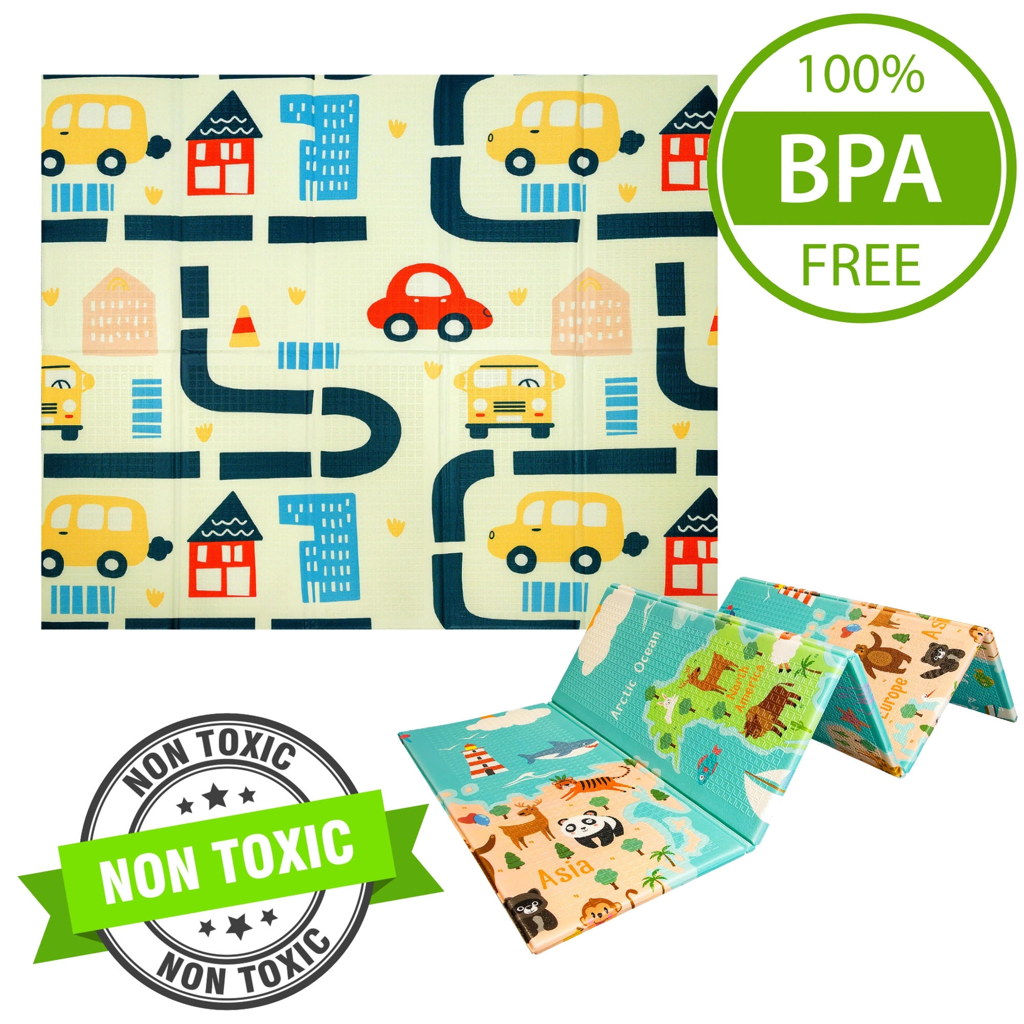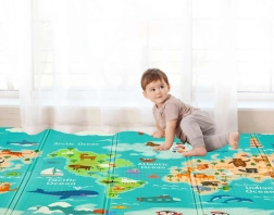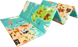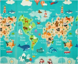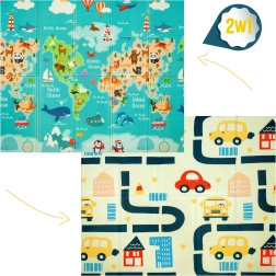 Η μία πλευρά με πολύχρωμο χάρτη του κόσμου και ζώα, η άλλη με πόλη και δρόμους για αυτοκινητάκια. Δύο εκπαιδευτικά θέματα σε ένα στρωματάκι καλλιεργούν φαντασία και γνώσεις.