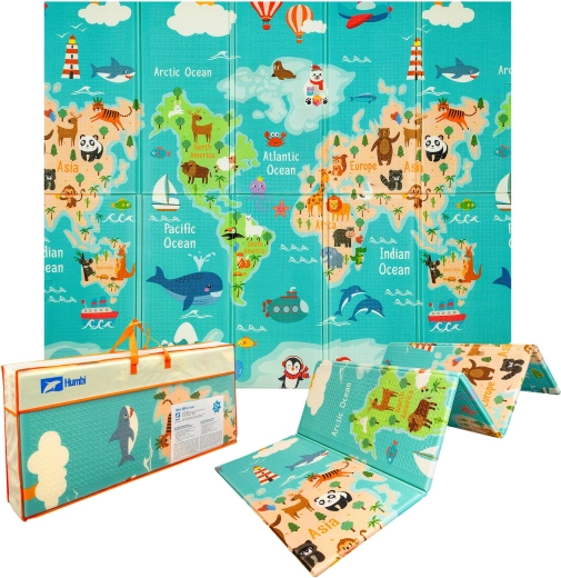 Ανακαλύψτε το ευρύχωρο και απαλό χαλάκι παιχνιδιού HUMBI από ποιοτικό αφρό XPE, διαστάσεων 200 × 180 × 1 cm. Είναι διπλής όψης – η μία πλευρά με πολύχρωμο χάρτη του κόσμου, η άλλη με αστικούς δρόμους – και προσφέρει ασφαλή, αδιάβροχη και εύκολα καθαριζόμενη επιφάνεια για βρέφη και παιδιά από νεογέννητα. Χάρη στον πτυσσόμενο σχεδιασμό και την πρακτική τσάντα στη συσκευασία ταιριάζει άψογα σε παιδικό δωμάτιο, σαλόνι ή κήπο. Χωρίς επιβλαβείς ουσίες, πιστοποιήσεις CE, EN71 και REACH για μέγιστη σιγουριά των γονέων.