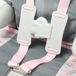 Ο γκρι‑ροζ χρωματισμός με σχέδιο ουράνιου τόξου είναι όχι μόνο χαριτωμένος αλλά και πρακτικός – τα υλικά είναι ανθεκτικά και ευχάριστα στην αφή. Το κάθισμα είναι κατάλληλο για κούκλες έως 46 cm και ταιριάζει τέλεια για παιχνίδι στο σπίτι, στις βόλτες και κατά τη «σίτιση» των κουκλών.