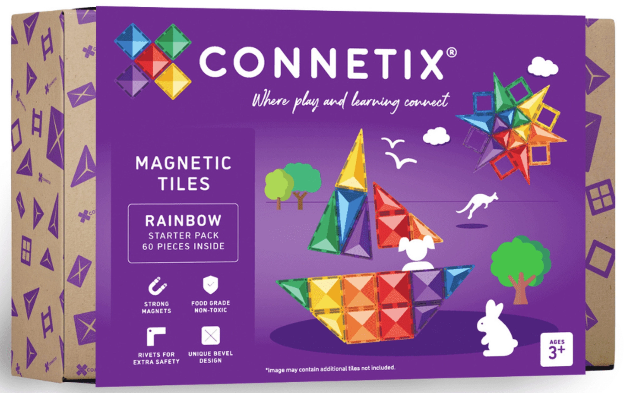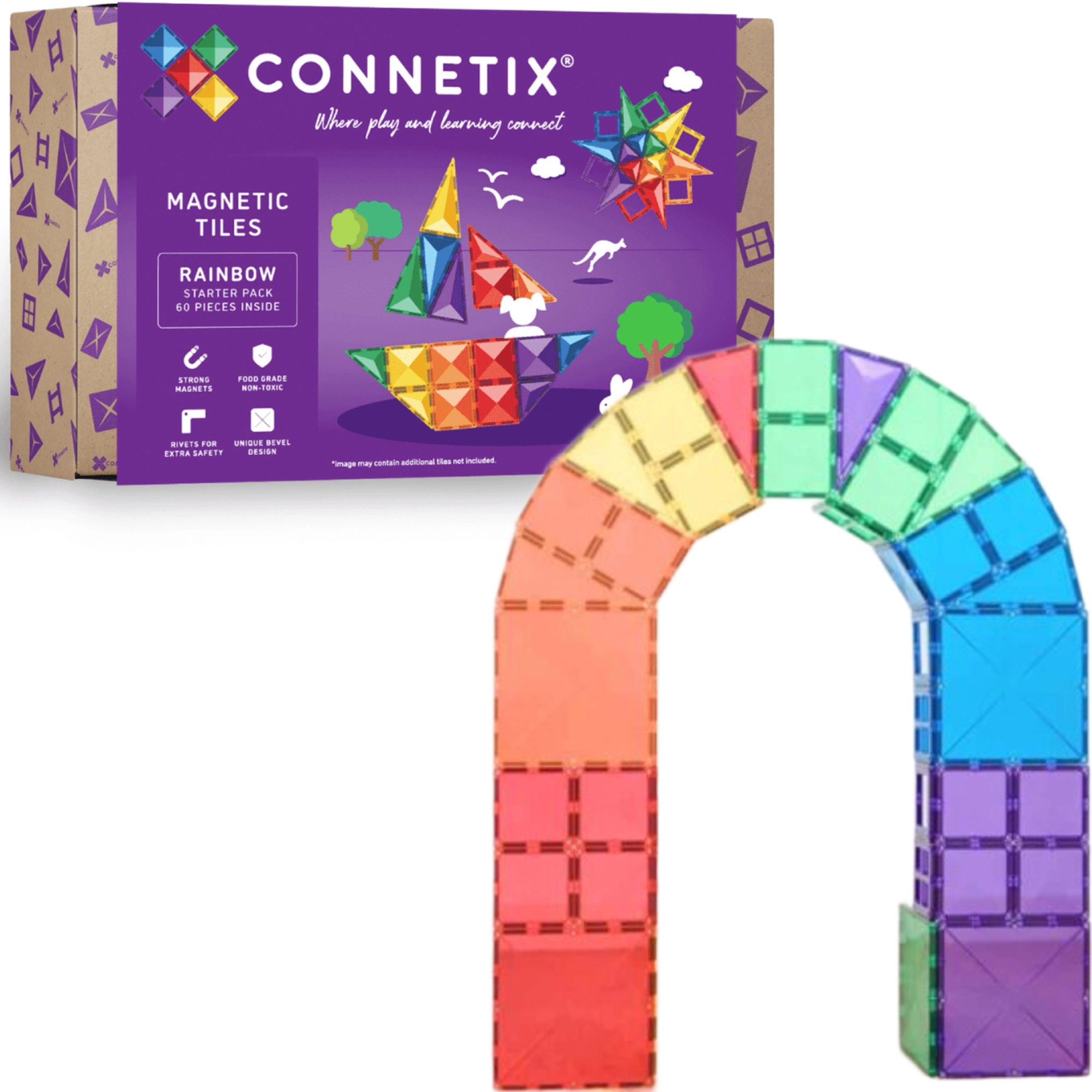 Το αρχικό σετ CONNETIX Rainbow Starter Pack προσφέρει 60 ποιοτικά, ημιδιάφανα μαγνητικά πλακίδια σε έντονα χρώματα, με στρογγυλεμένες άκρες και πολύ ισχυρούς νεοδυμικούς μαγνήτες για σταθερές κατασκευές. Τα παιδιά θα αγαπήσουν το χαρακτηριστικό «κλικ» κατά τη σύνδεση, ενώ παράλληλα αναπτύσσουν φυσικά μαθηματικά, φυσική, τεχνολογία και τέχνη.