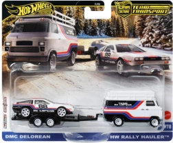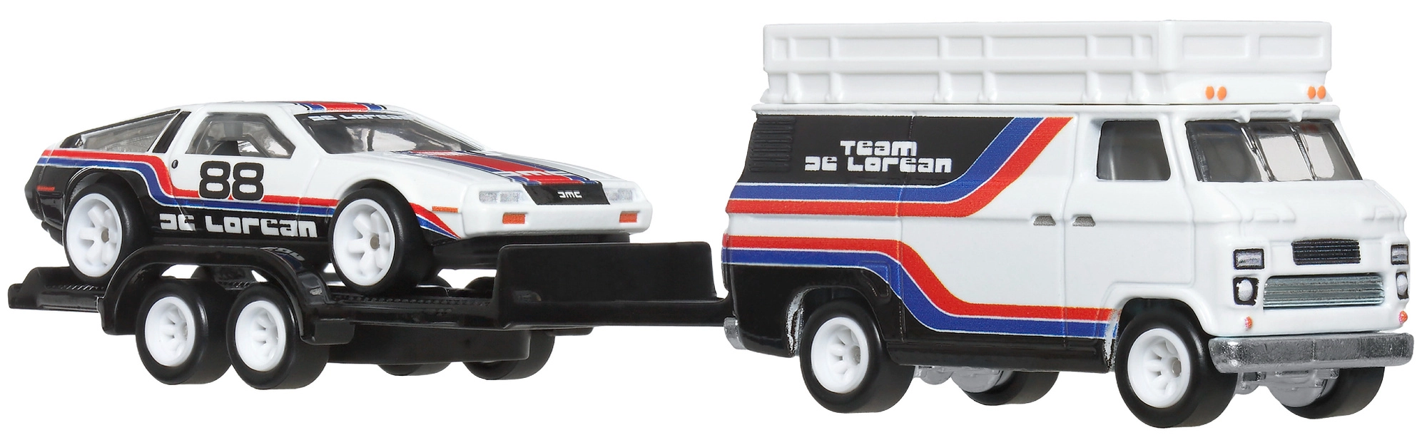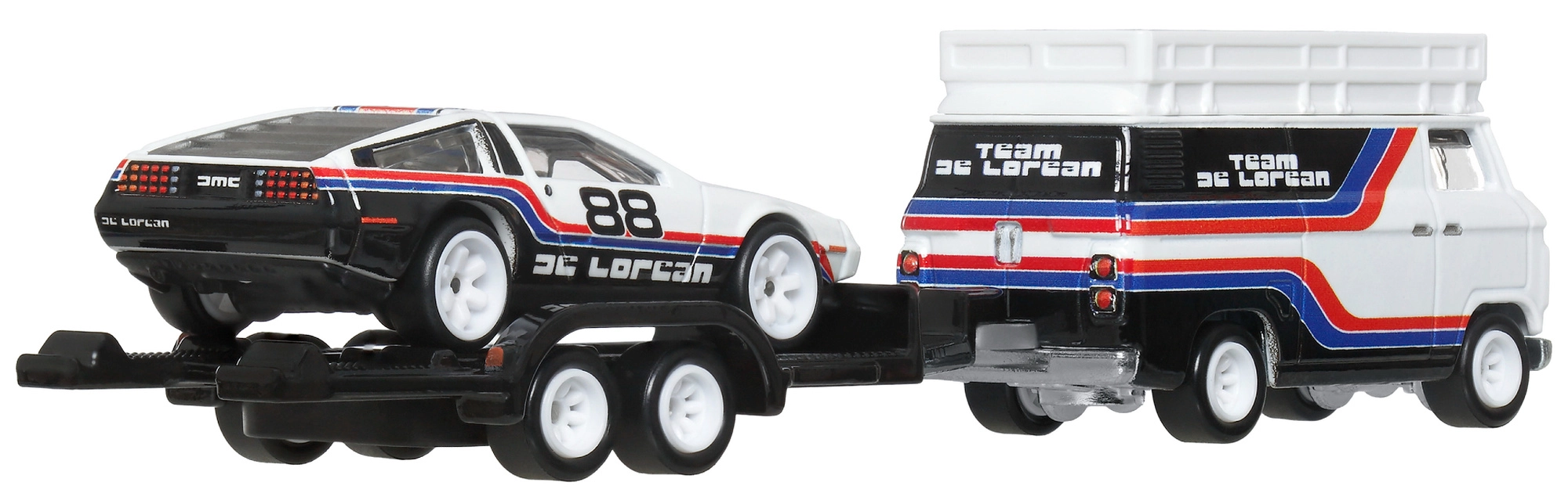 Ένα αποκλειστικό σετ από τη σειρά Hot Wheels Premium Team Transport φέρνει το εμβληματικό DMC DeLorean #78 σε ρυμουλκούμενο πίσω από ένα στιλάτο rally hauler. Χάρη στην κατασκευή Metal/Metal, τα ρεαλιστικά ελαστικά Real Riders και την λεπτομερή εκτύπωση Team DeLorean, είναι ιδανική επιλογή για συλλέκτες και παιδιά από 3 ετών.