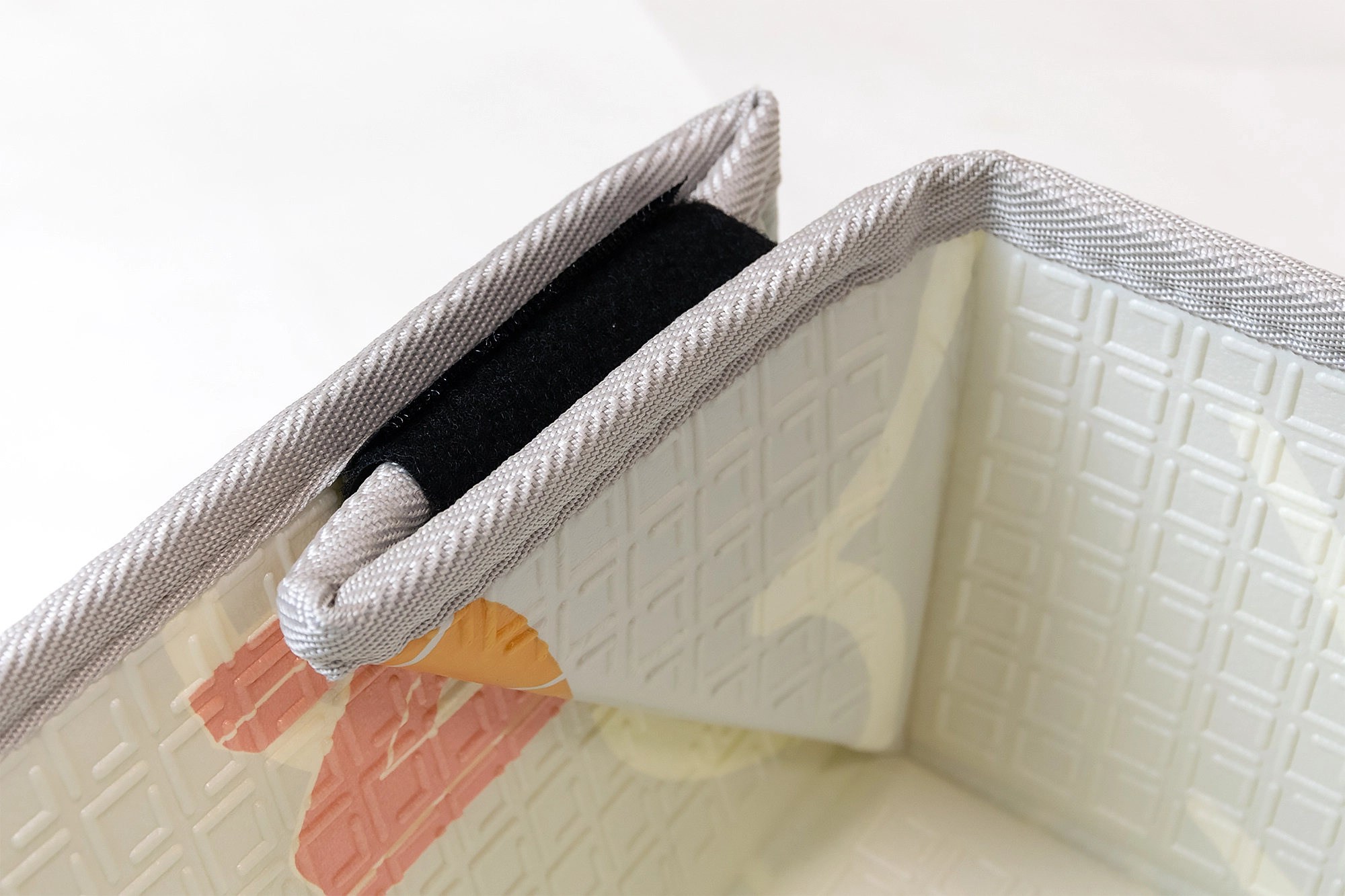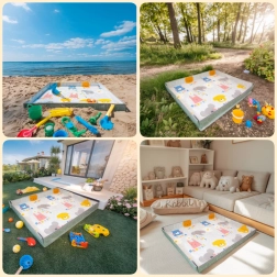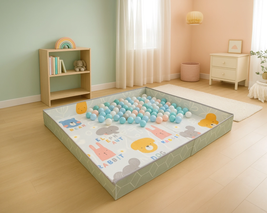 Ειδικά αυτοκόλλητα κουμπώματα επιτρέπουν σε δευτερόλεπτα να σηκώσετε τα πλαϊνά και να δημιουργήσετε μαλακό χώρο-παρκοχώρο ή ball pit – απλώς προσθέστε μπαλάκια. Το χαλάκι είναι αναδιπλούμενο, ελαφρύ και εύκολο στο καθάρισμα (αρκεί ένα νωπό πανί). Στη συσκευασία θα βρείτε και μια πρακτική τσάντα μεταφοράς με φερμουάρ για άνετη αποθήκευση και μετακίνηση.