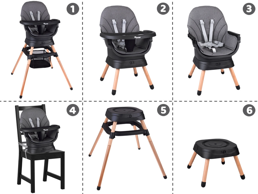 - 6 λειτουργίες σε 1 – καρεκλάκι, χαμηλό καρεκλάκι, πολυθρόνα, αντάπτορας για καρέκλα, ψηλό σκαμπό, χαμηλό σκαμνάκι.