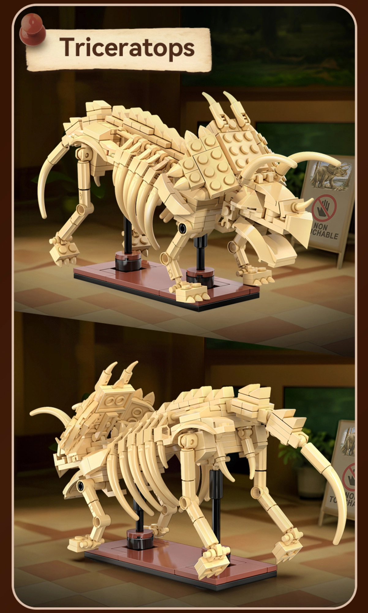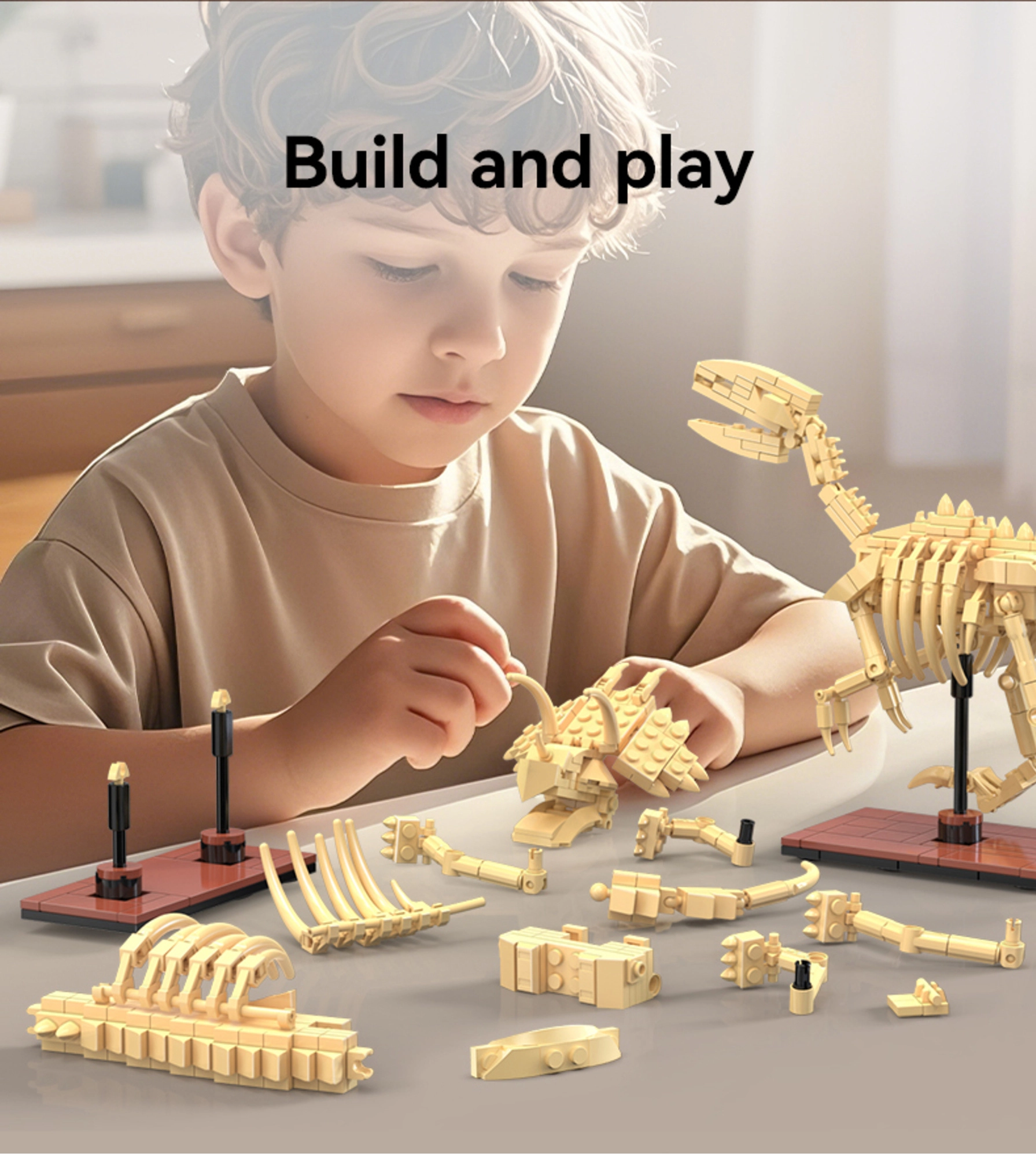 Χάρη στις κινούμενες αρθρώσεις του λαιμού, των άκρων και της ουράς αλλάζετε εύκολα στάσεις. Η αρθρωτή κατασκευή επιτρέπει σύνδεση με άλλα σετ της σειράς και επέκταση της συλλογής. Όλα συναρμολογούνται διαισθητικά – χωρίς κόλλα και εργαλεία, με στιβαρές συνδέσεις συμβατές με άλλα συστήματα κατασκευών.
