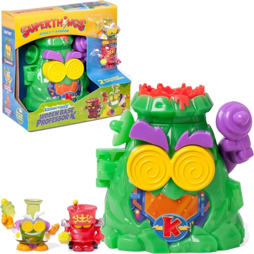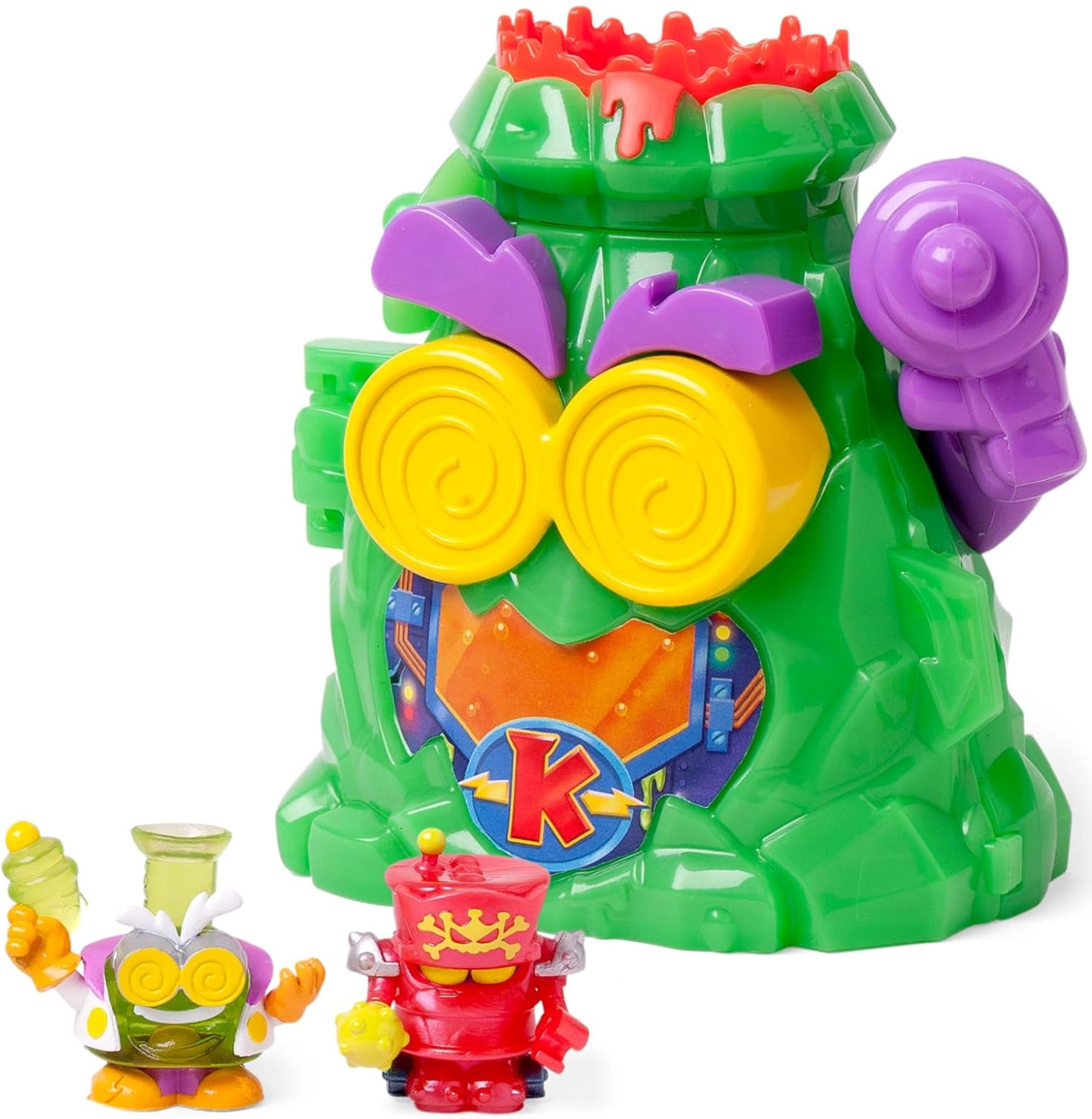 Εισέλθετε στη ηφαιστειακή κρυψώνα του κακού Professor K από τη σειρά Kazoom Power και κυριαρχήστε στο κρυφό μυστικό εργαστήριό του. Ανοίξτε το «πρόσωπο» του ηφαιστείου, ενεργοποιήστε τις παγίδες και ξεκινήστε τη διασκέδαση με μηχανικές λειτουργίες. Αυτό το σετ προσφέρει διαδραστικό παιχνίδι, αγωνία και πολλές δυνατότητες για να δημιουργήσετε τις δικές σας ιστορίες στο Kaboom City.