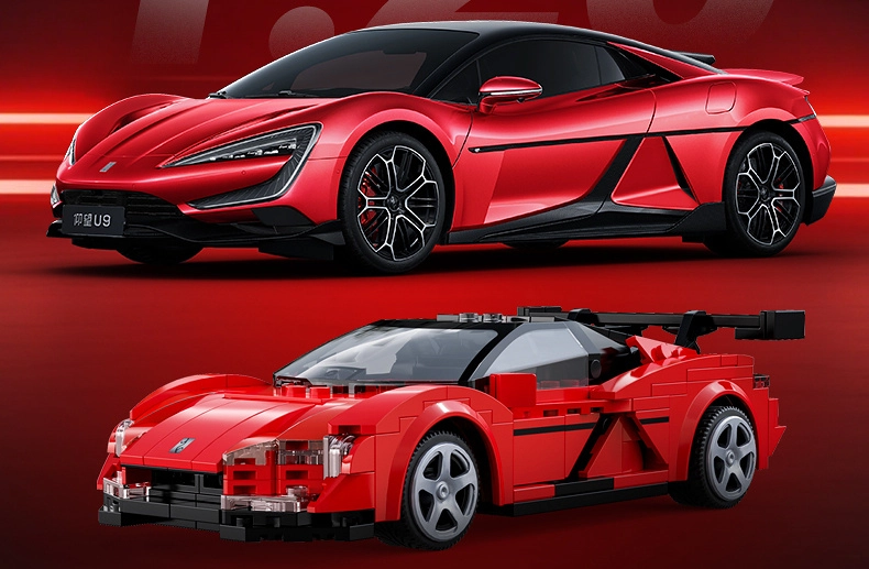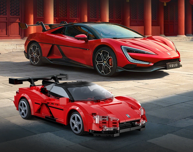 Κόκκινο αμάξωμα με εκτύπωση, διαφανείς προβολείς και μεγάλη πίσω αεροτομή που αναπαράγουν πιστά την εμφάνιση του σπορ οχήματος YANGWANG U9.