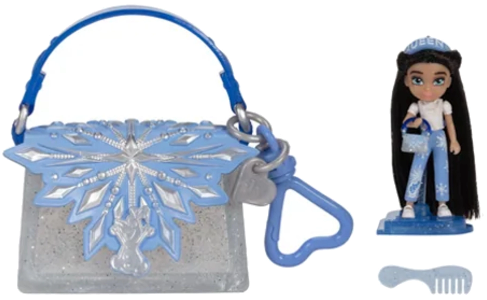 Αυτή η μινιατούρα μόδας από τη συλλογή Disney ILY 4Ever Tote Teenies συνδυάζει τον κόσμο της μόδας και της φαντασίας. Έχει μακριά σκούρα μαλλιά, φοράει μπλε-λευκό σύνολο με μοτίβο νιφάδων χιονιού και ολοκληρώνεται με αθλητικά παπουτσάκια και μίνι τσαντάκι με νιφάδα. Ιδανική για μικρούς λάτρεις του κόσμου της Disney και για συλλέκτες.