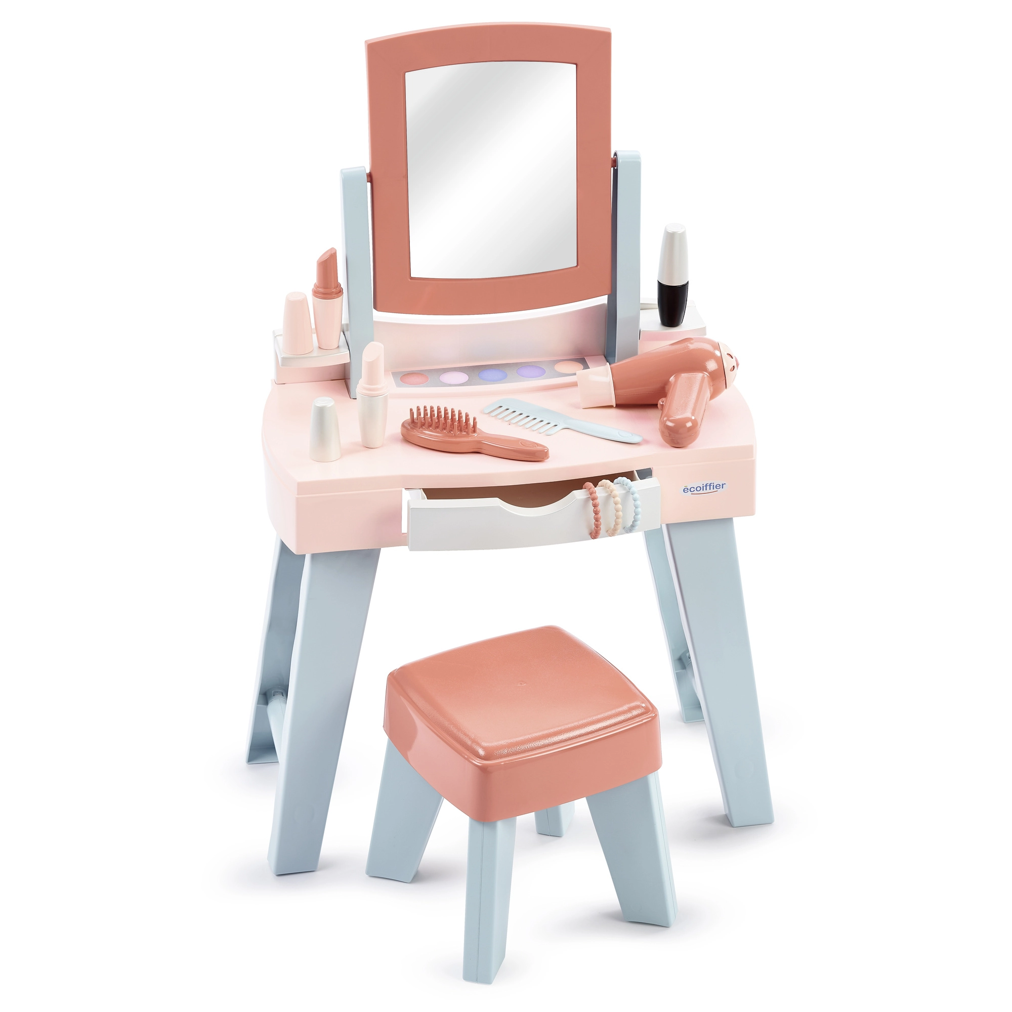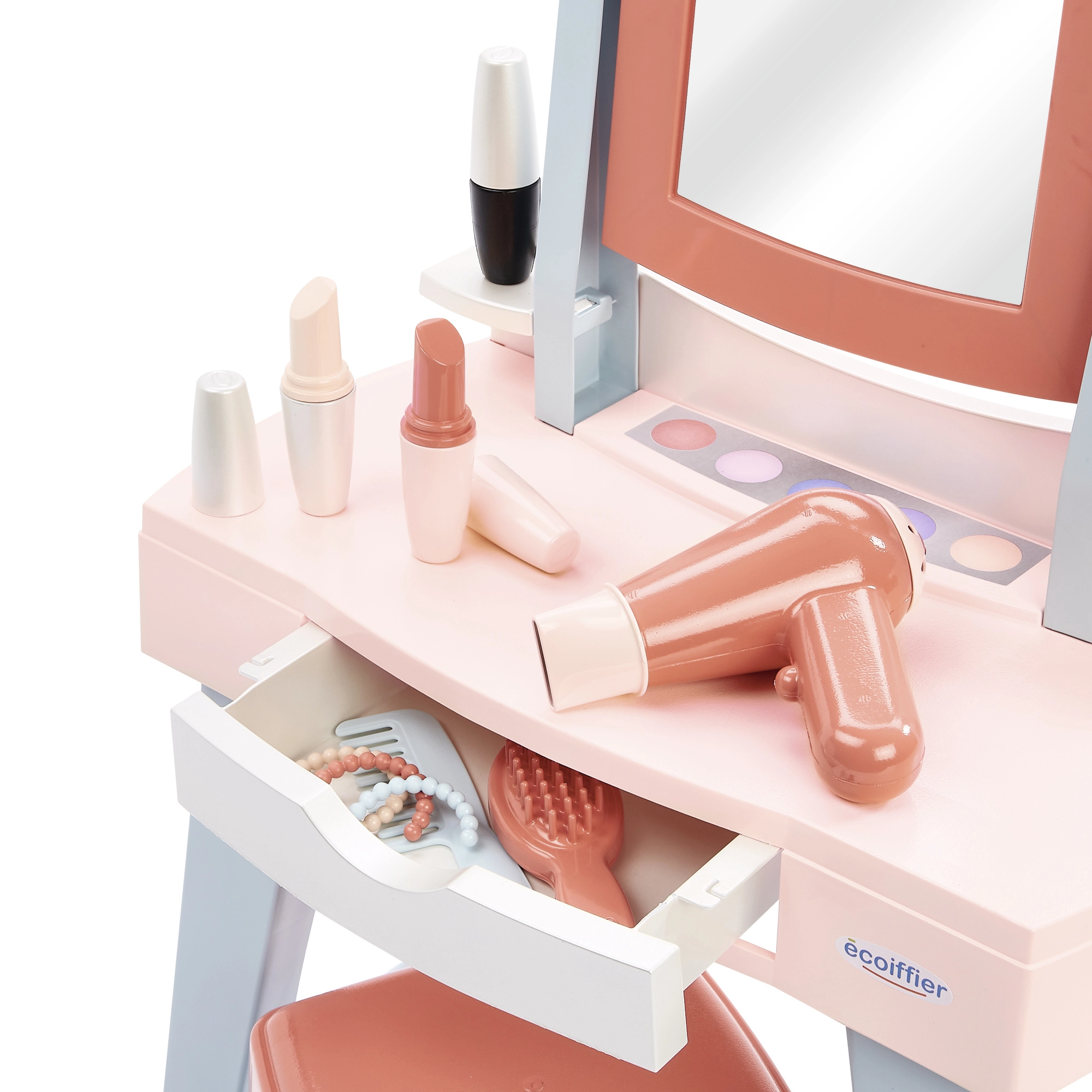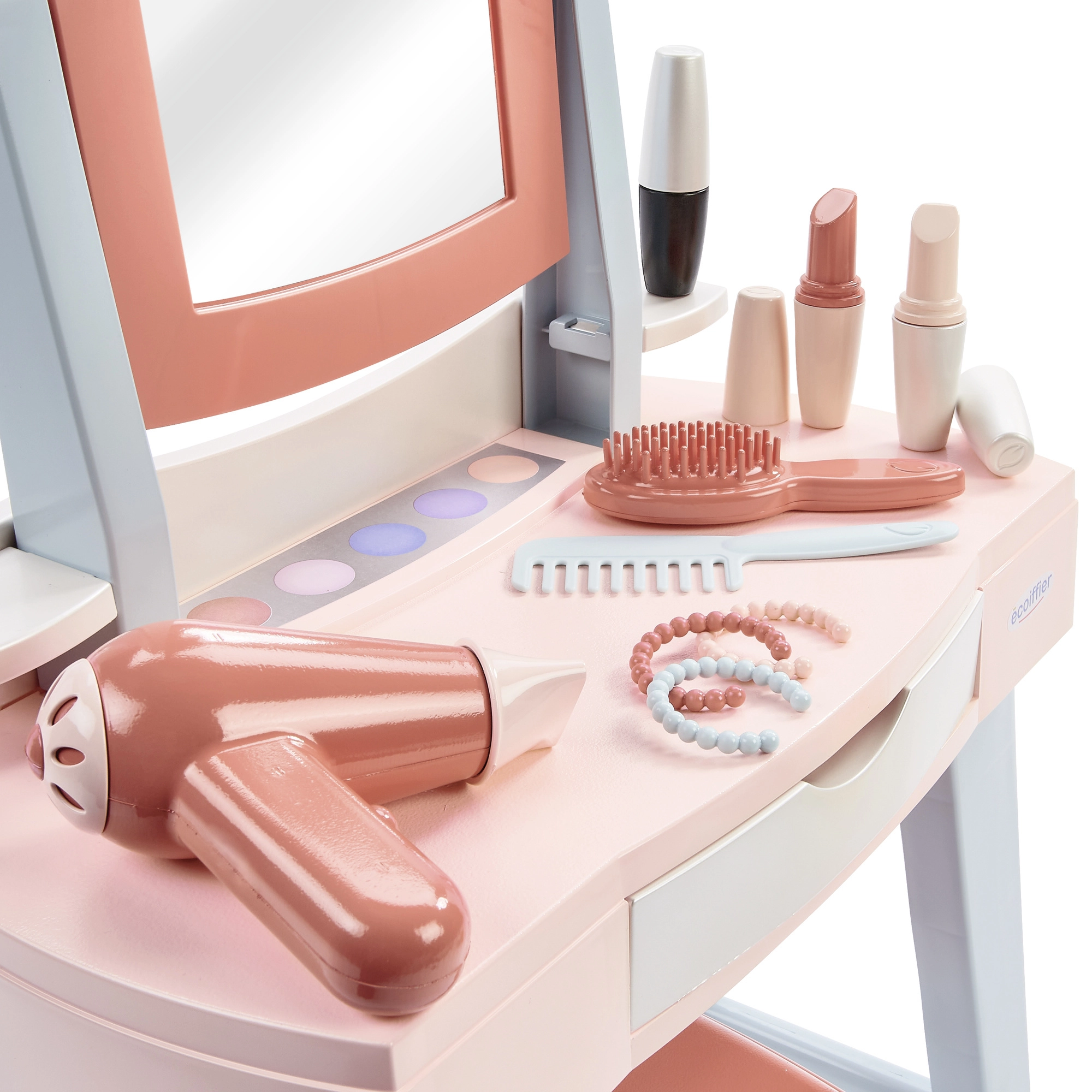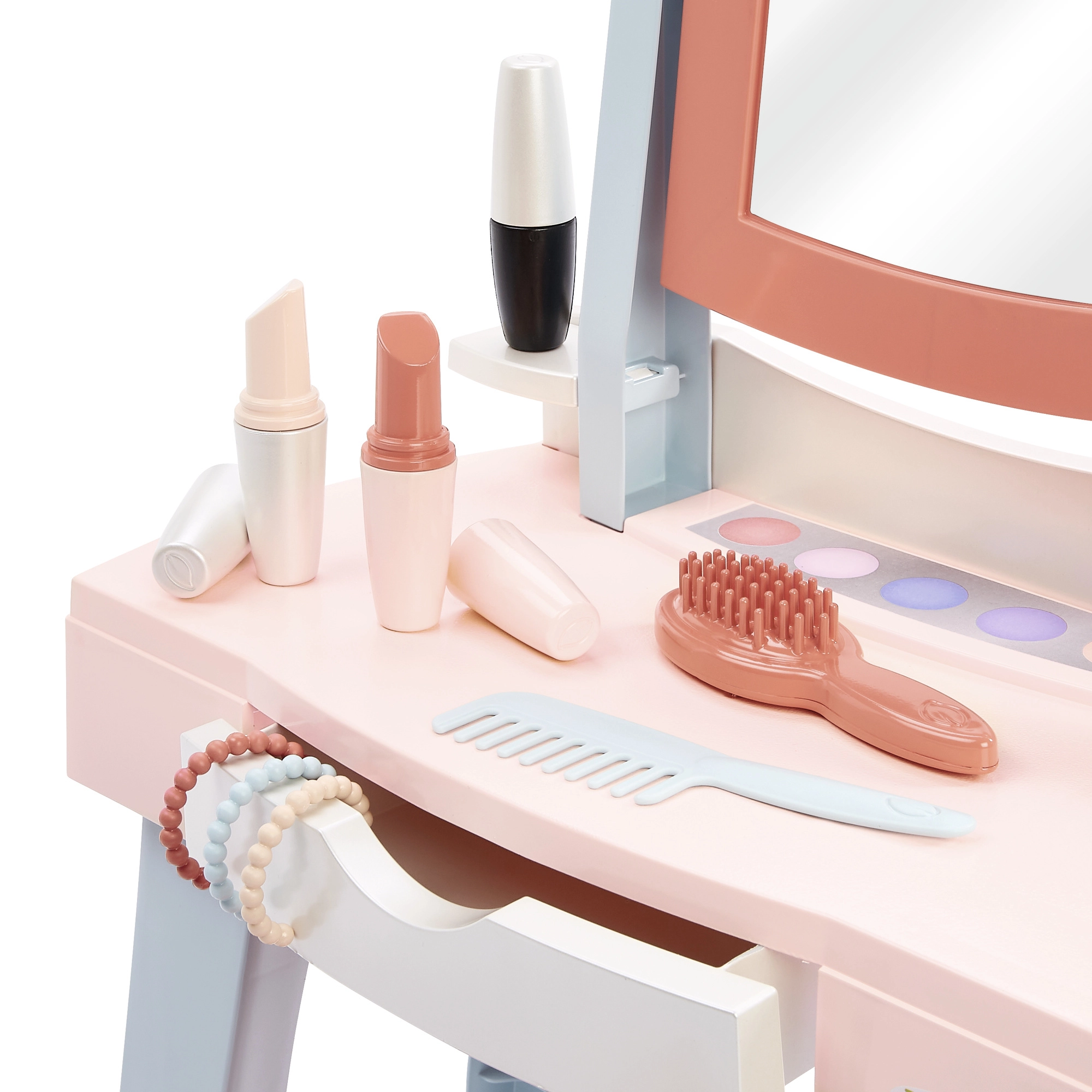Ενσωματωμένος καθρέφτης για παιχνίδι μακιγιάζ και χτενισμάτων, μαζί με συρόμενο συρτάρι για τακτική αποθήκευση όλων των αξεσουάρ.