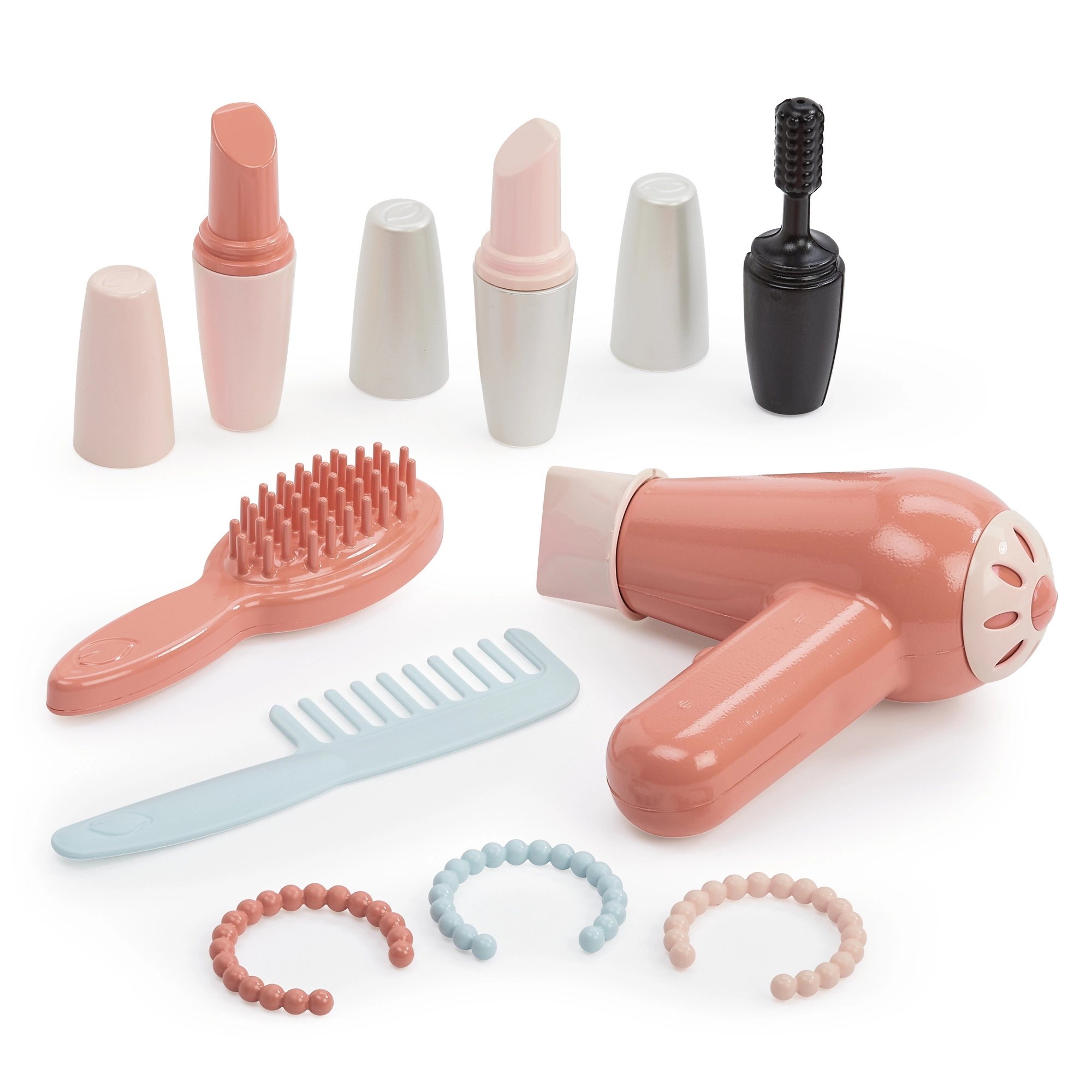 Περιλαμβάνονται χτένα, βούρτσα, παιδικό σεσουάρ, «κραγιόν», «μάσκαρα», παλέτα και βραχιολάκια – ιδανικά για ευφάνταστο παιχνίδι κομμωτηρίου και ομορφιάς.