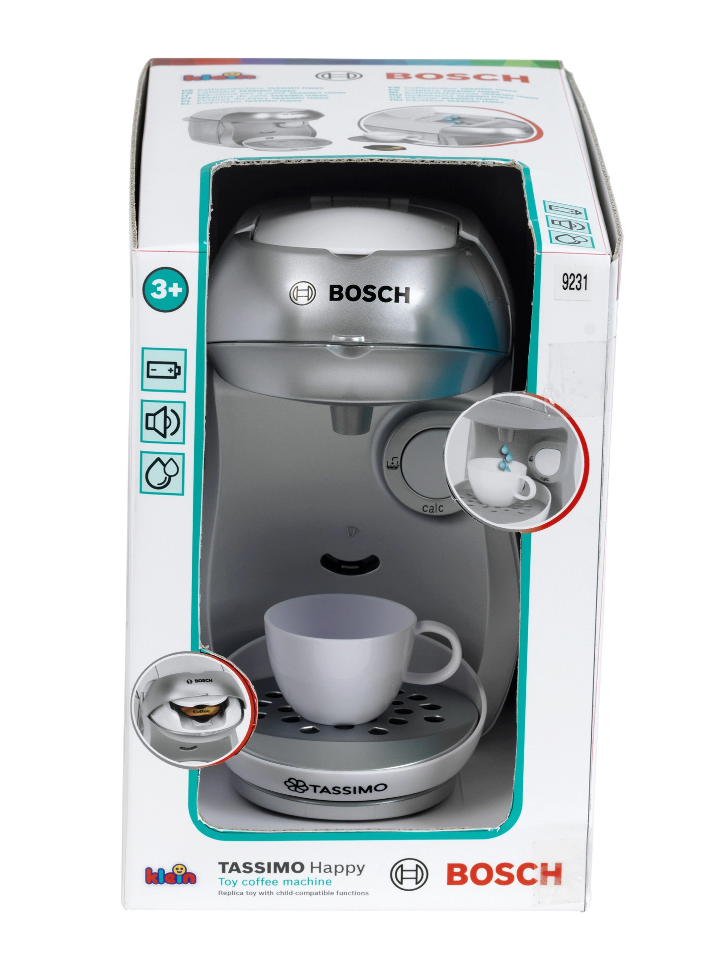 Ρεαλιστική παιδική καφετιέρα TASSIMO BOSCH από τη μάρκα Klein που θα ενθουσιάσει τους μικρούς barista με αυθεντικές λειτουργίες. Διαθέτει ανοιγόμενο επάνω καπάκι για κάψουλες, στάτη/δίσκο αποστράγγισης, πραγματική ροή νερού και ηχητικά εφέ που μιμούνται την πραγματική λειτουργία. Περιλαμβάνονται φλιτζάνι, πιατάκι, κουταλάκι και κάψουλες για ασφαλές και δημιουργικό παιχνίδι.