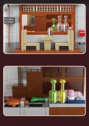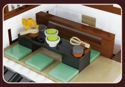 Στο ισόγειο σας περιμένει ένας ζεστός χώρος με πάγκο και γκριλ, ενώ στον όροφο υπάρχει κομψό δωμάτιο τσαγιού. Οι συρόμενες πόρτες και ο πλούσιος εξοπλισμός (φαγητό, σετ τσαγιού) κάνουν το μοντέλο εξαιρετικό έκθεμα και διασκεδαστικό πρότζεκτ για κατασκευαστές από 14 ετών. Τα LED φώτα με εφέ απογειώνουν την ατμόσφαιρα και το βράδυ το μοντέλο κυριολεκτικά ζωντανεύει.